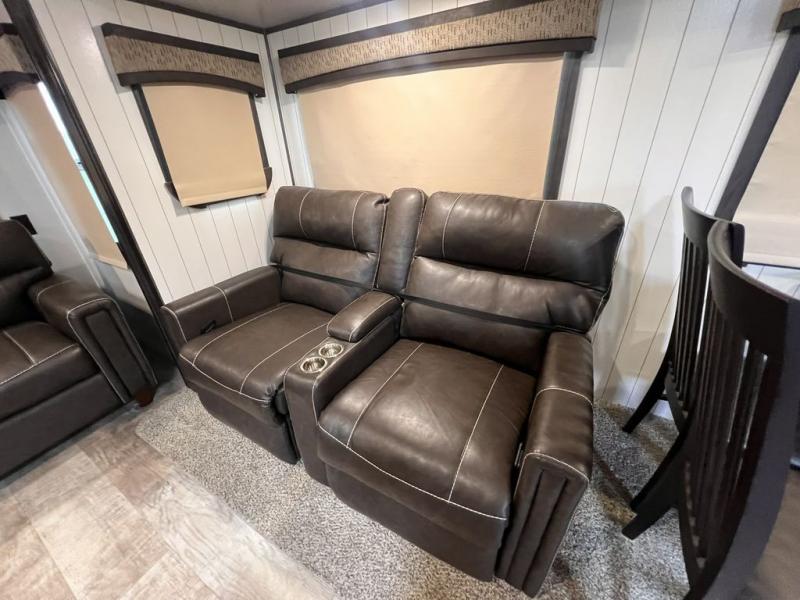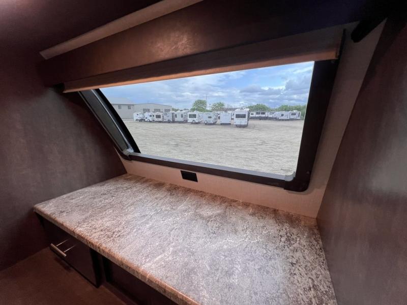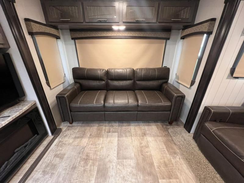 Opposite the kitchen area you will find lots of seating with a booth dinette and 64" sofa slide out. Opposite the sofa enjoy an entertainment center with fireplace located within the kitchen slide out. There is a second larger sofa along the rear wall that features overhead storage, and it is 88" long.