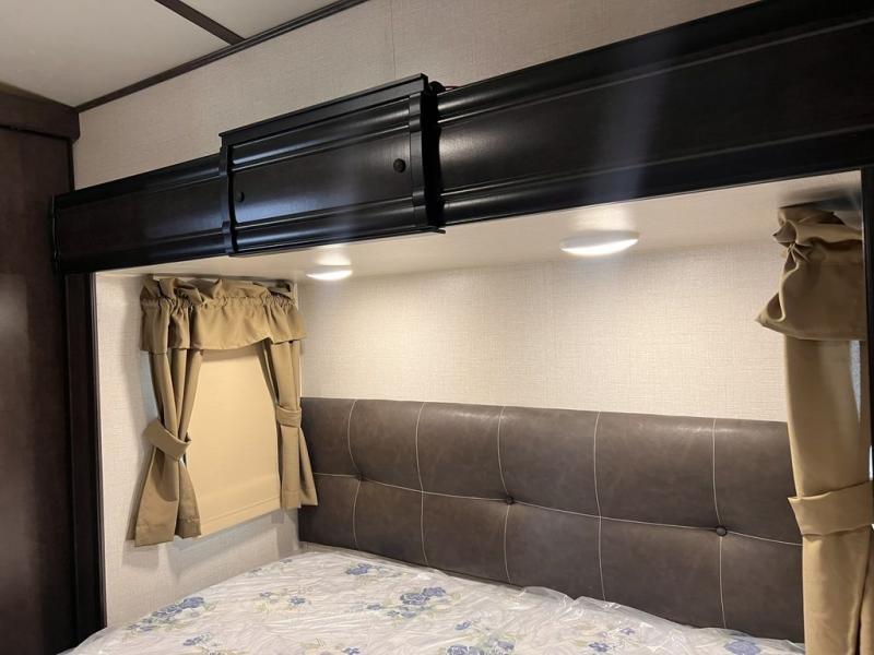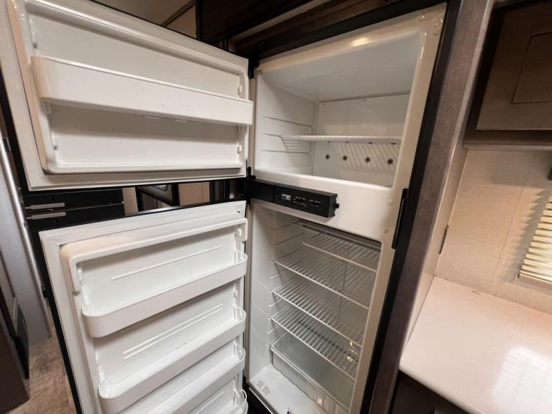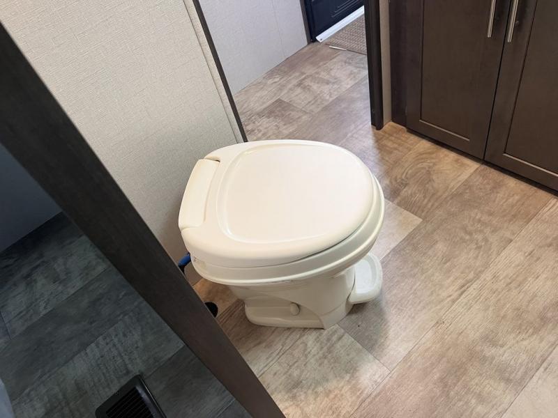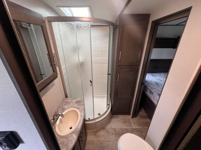 Inside the bedroom you will enjoy some added floor space thanks to the slide out queen size bed. Along the front wall a pair of wardrobes for clothing storage, and some overhead cabinetry as well. Opposite the queen bed find a chest of drawers for more storage for your belongings.