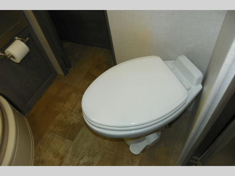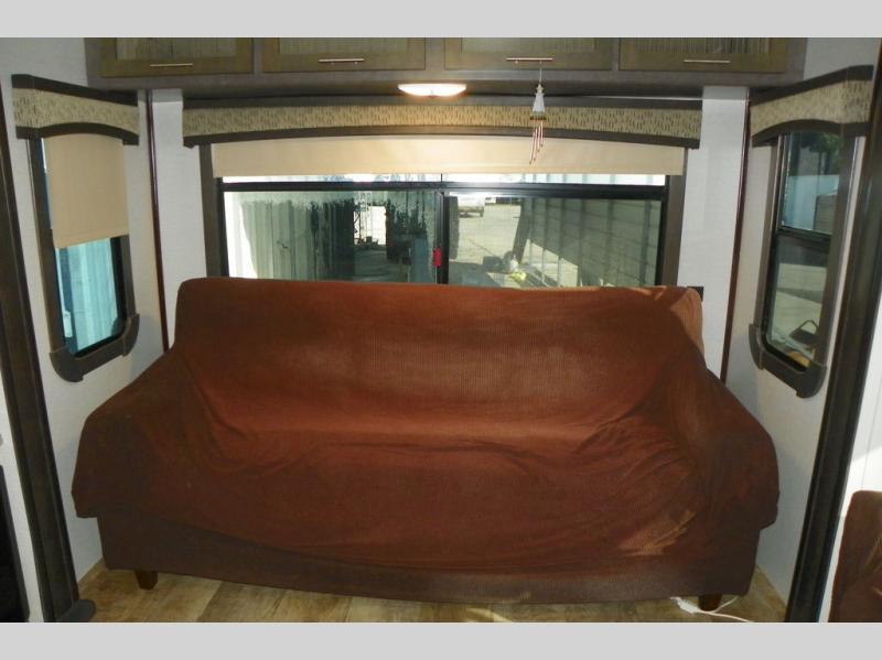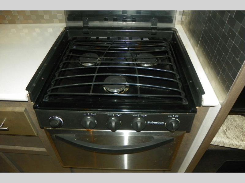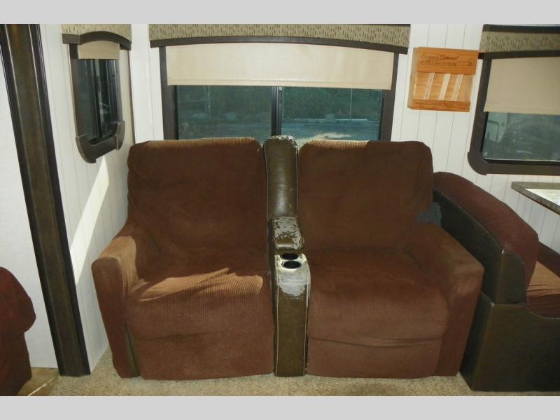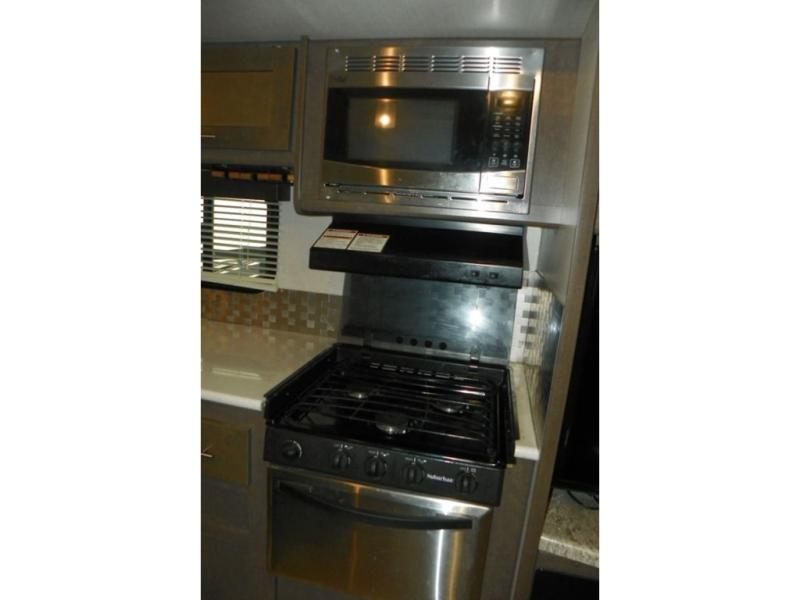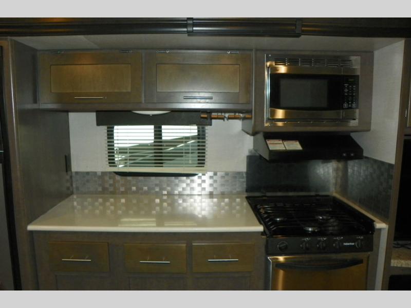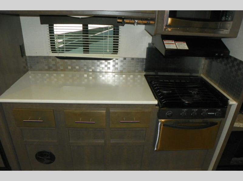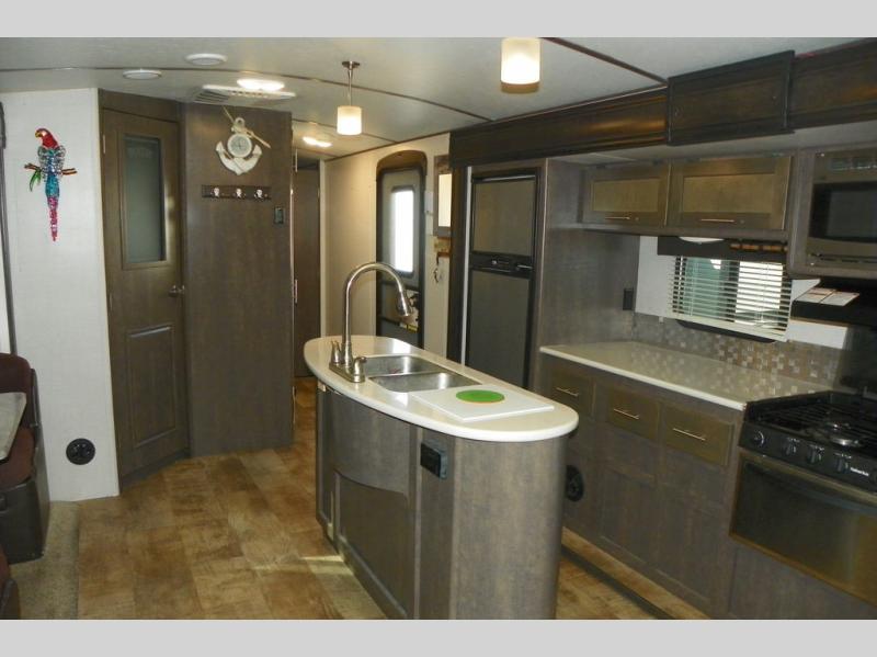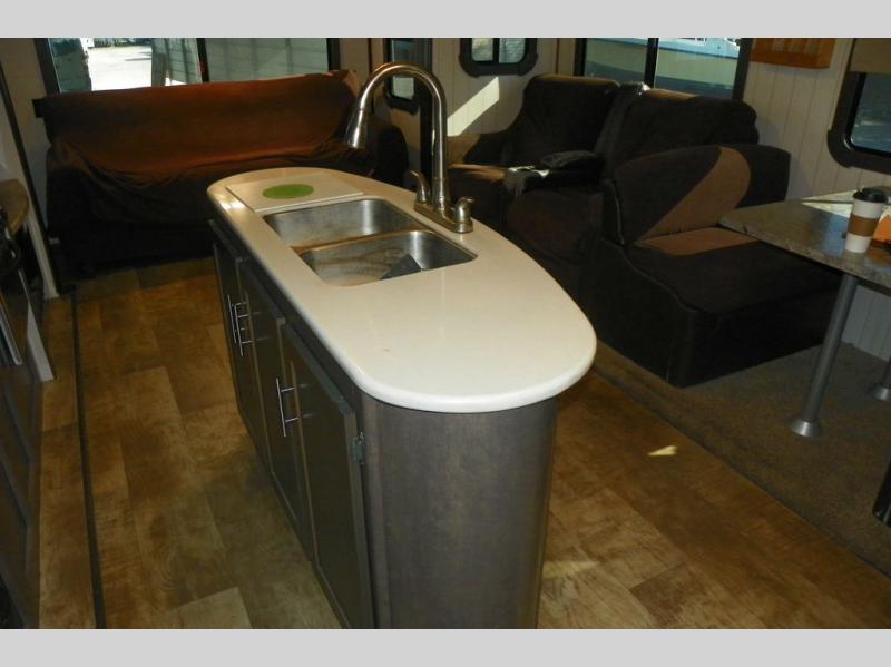 As you enter the travel trailer, to the left is a slide out featuring a refrigerator, extra counter space, a three burner range, microwave, overhead storage, and an entertainment center. On the opposite side is a slide with two lounge chairs and a dinette. Next to the slide there is a large pantry and closet on the interior wall. The kitchen island offers extra counter space and a double sink. Along the rear wall is a sofa and overhead storage completing the rear living layout.