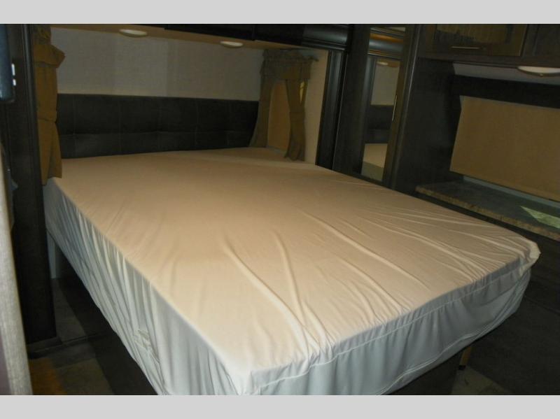 The front bedroom greets you with a queen bed slide out to your left, a dresser to your right, and a front wall wardrobe.