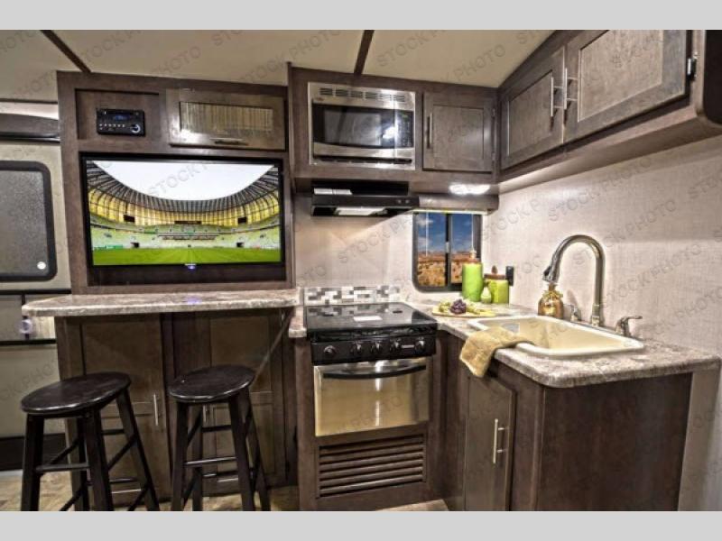 The kitchen area features two bar stools, pantry, spot for a TV, four burner range, and a large sink. There is ample storage in the overhead cabinets for your daily dishes and other kitchen items to be stored.
