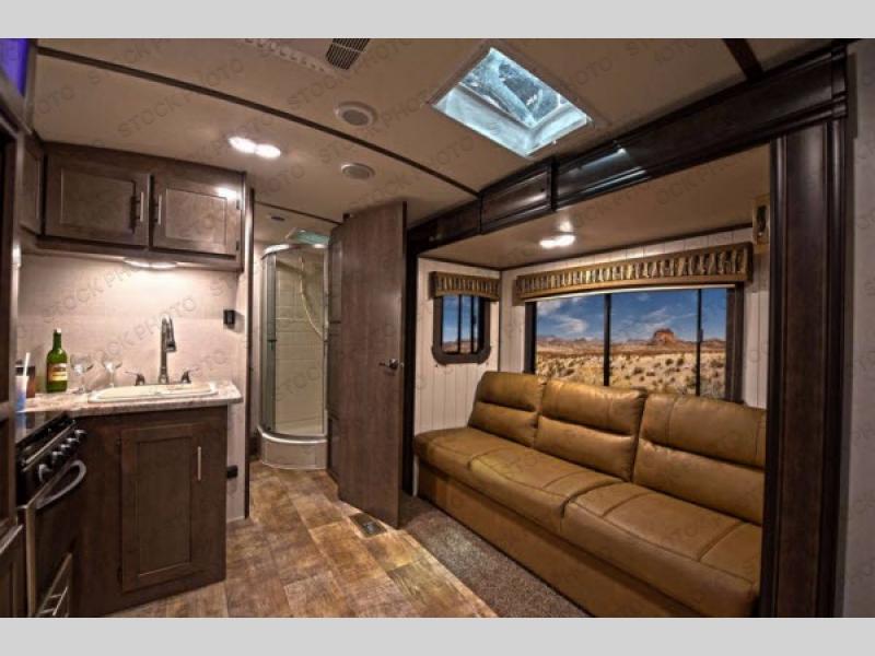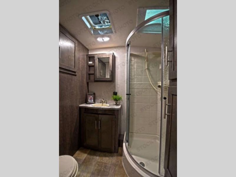 On the inside notice that the full bathroom is located in the rear of this model. There is a corner shower, toilet, linen cabinet, and a vanity with sink. You will also find an overhead medicine cabinet as well.
