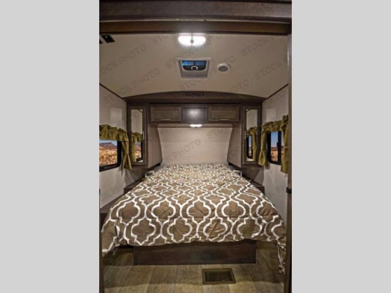 A space saving sliding door leads into the front master bedroom which provides a space with a queen size bed, dual wardrobes, and a front overhead cabinet, plus more!