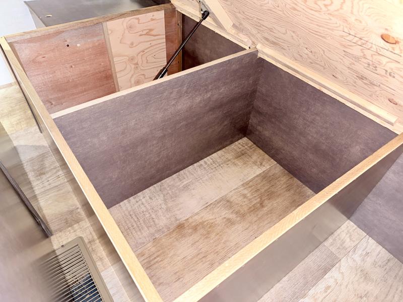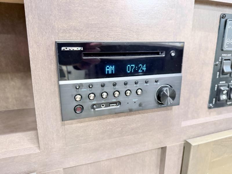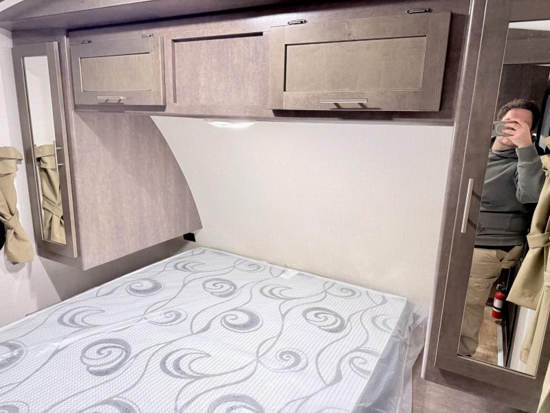 The front bedroom can be accessed from either side of the living room entertainment center through sliding doors. Inside you will find a comfortable queen size bed with dual wardrobes, and a large front overhead space for your things. The sliding doors provide privacy, and are space saving as well.