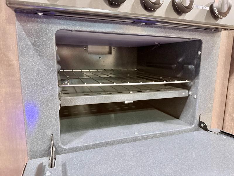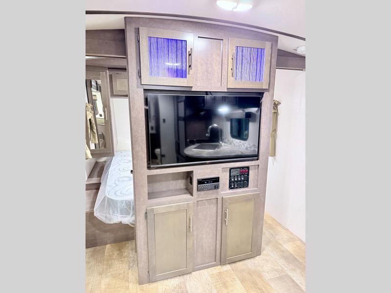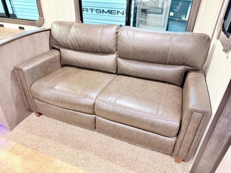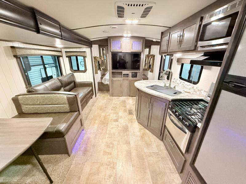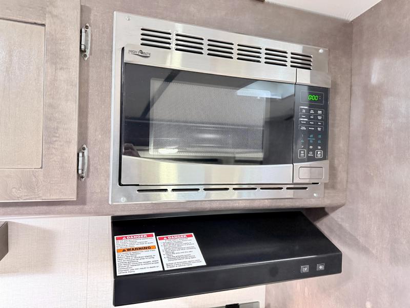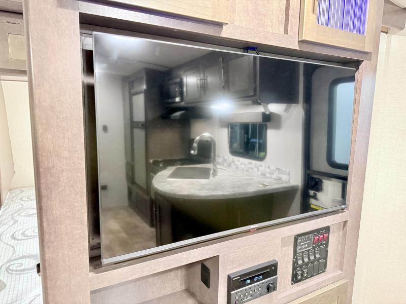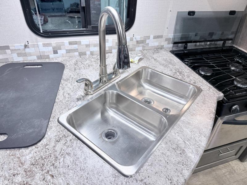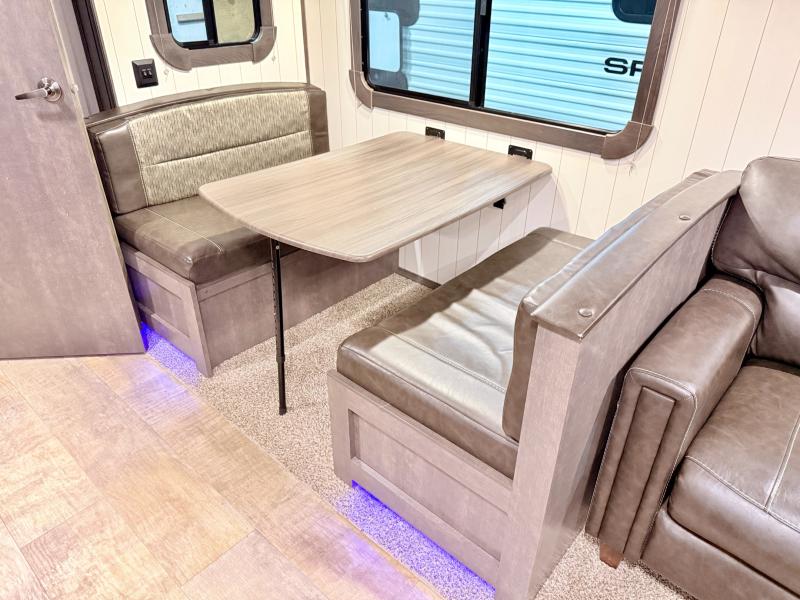 Step inside and notice how open it feels with the large sofa and booth dinette slide fully extended. This provides plenty of daytime seating for relaxing, dining, or just kicking back watching TV. If you need added space at night you can create sleeping space from either quickly. The nearby entertainment center is easily viewable from either spot.