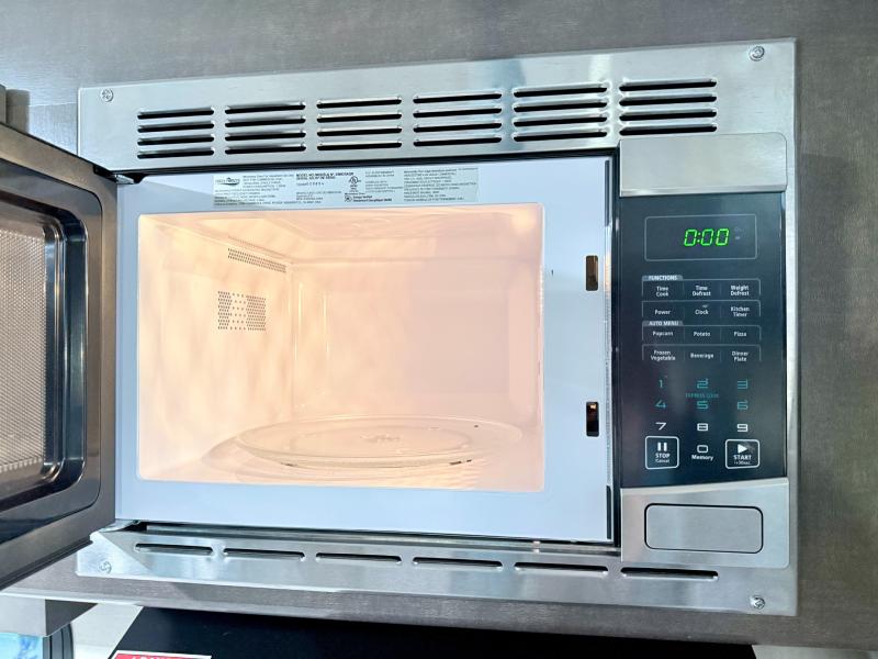 The kitchen area to the left of the door makes it easy to prepare and cook for your family. You will find a refrigerator, a three burner range with overhead microwave oven, and a ward/pantry, plus a double sink. There are also overhead cabinets that will keep your daily dishes all within easy reach.