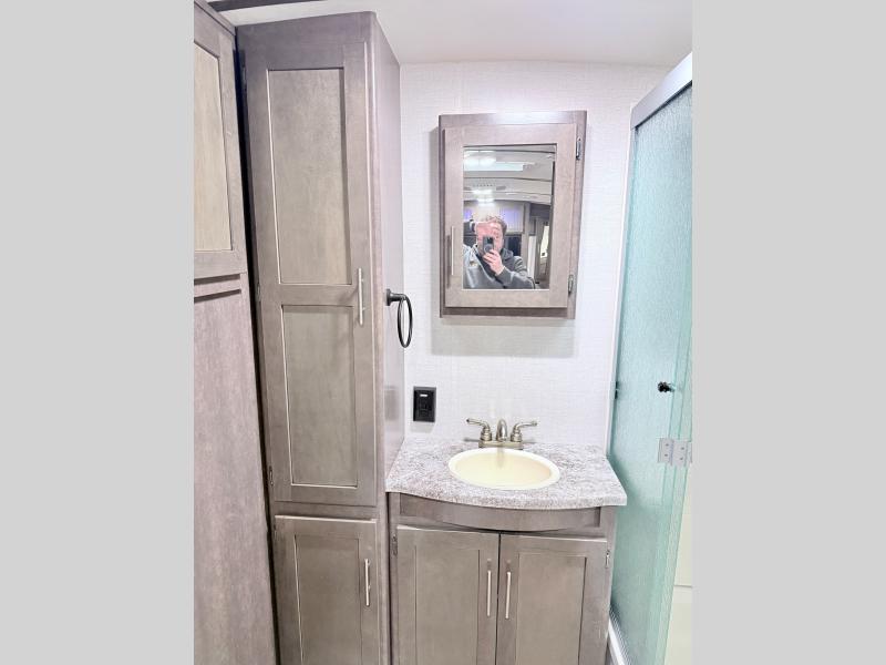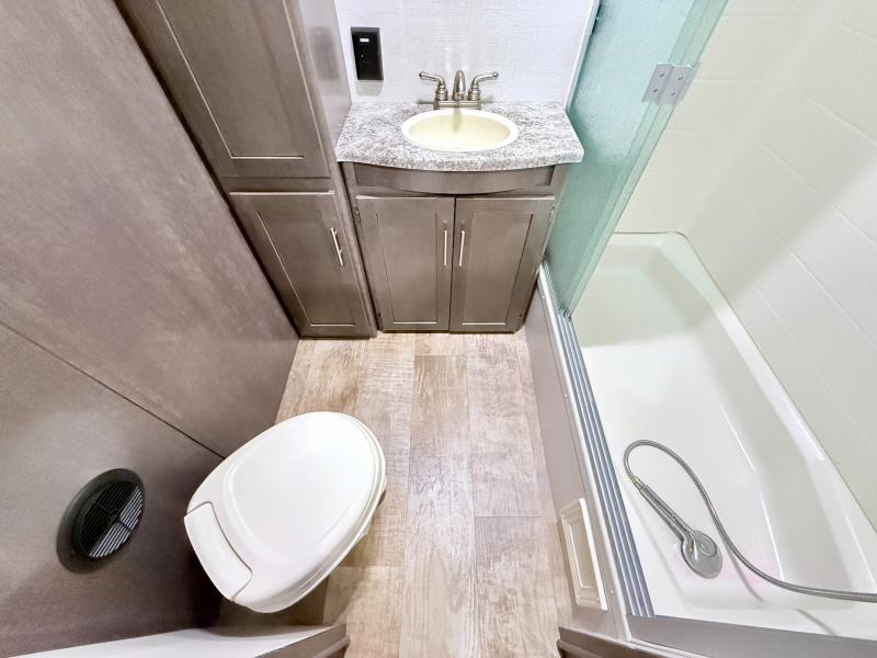 In the very rear of this Sunset Trail Super Lite you will find a convenient bathroom including a 27" x 54" shower, toilet, and vanity with sink. There is also a linen cabinet for towels and toiletries.