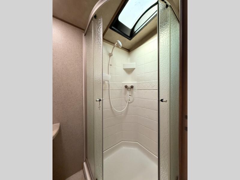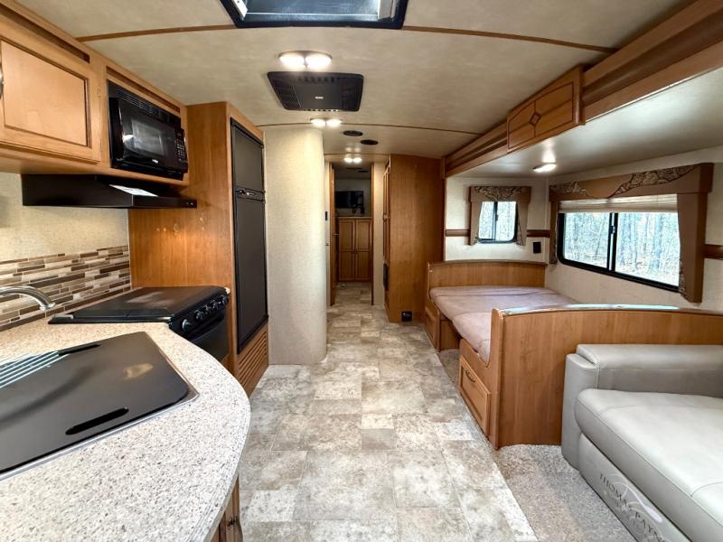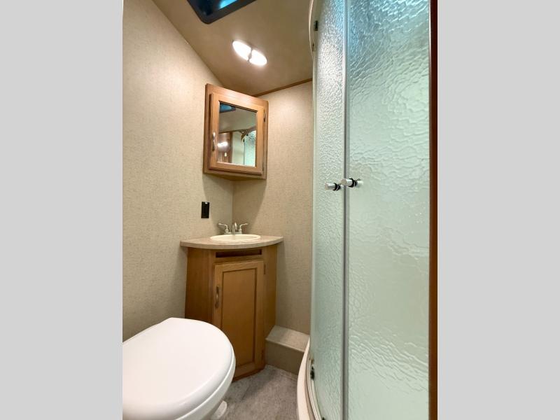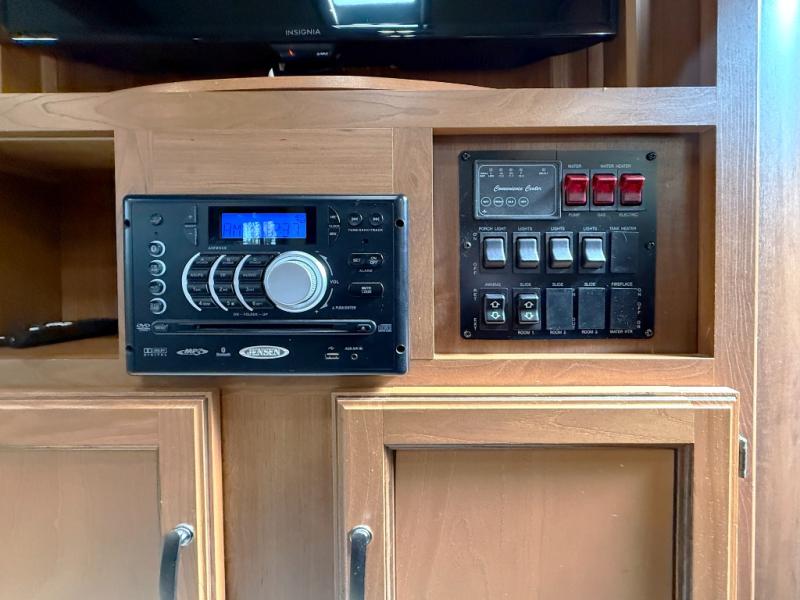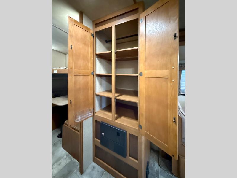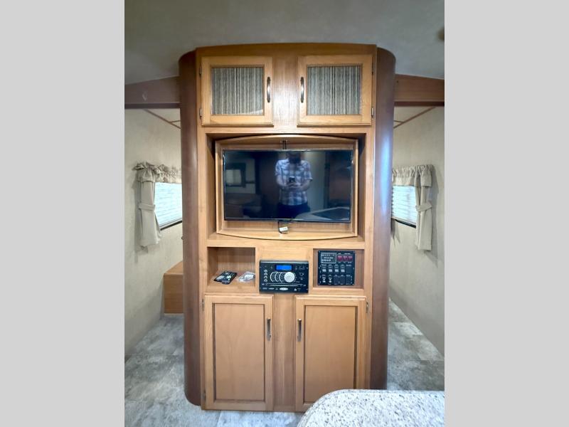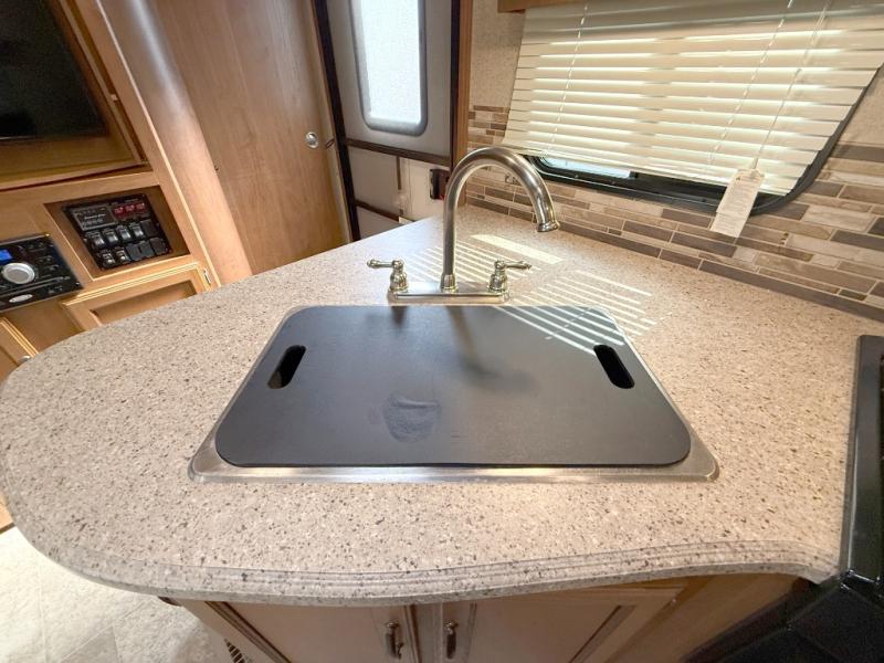 The main living area has a slide with a booth dinette and sofa. Next to the dinette is a large pantry for your dry goods and snacks. Along the front of the kitchen and living area there is an entertainment center for easy viewing from this combined space. Along the curb side wall there is an angled countertop including a double kitchen sink, three burner range, microwave, and a refrigerator.