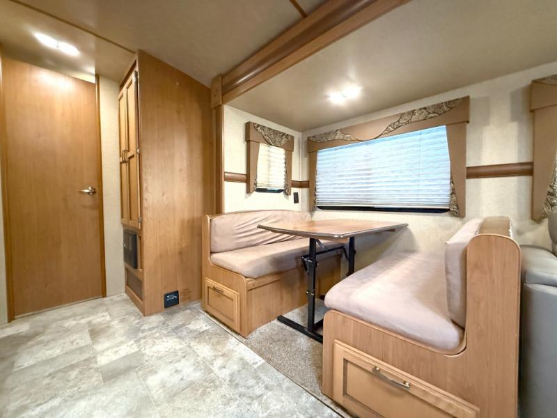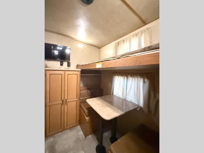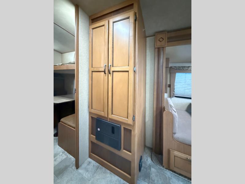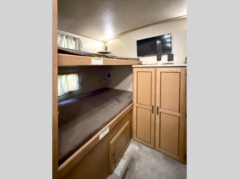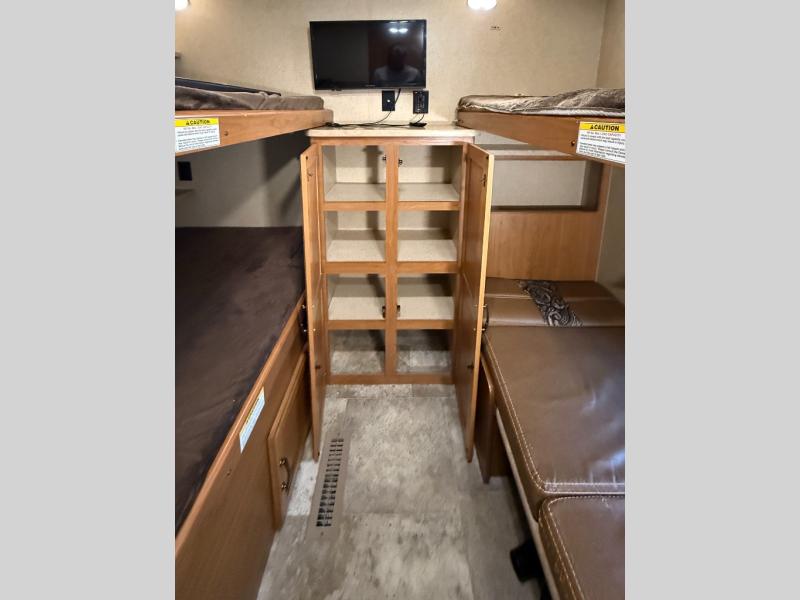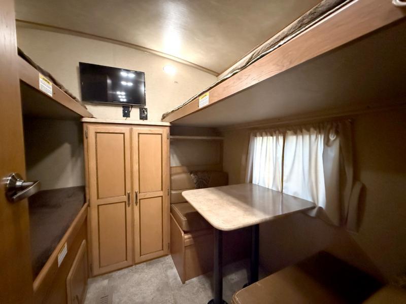 The private rear bunkhouse is a place that your kids or guests are sure to enjoy. There is a junior dinette with a flip-up bunk above and storage along one side, a wardrobe on the rear wall, and a set of bunk beds with corner storage on the opposite side of the dinette.