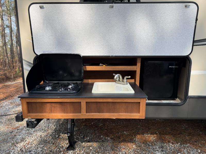 Outside you can even choose an optional kitchen with a two burner range, sink, and refrigerator.