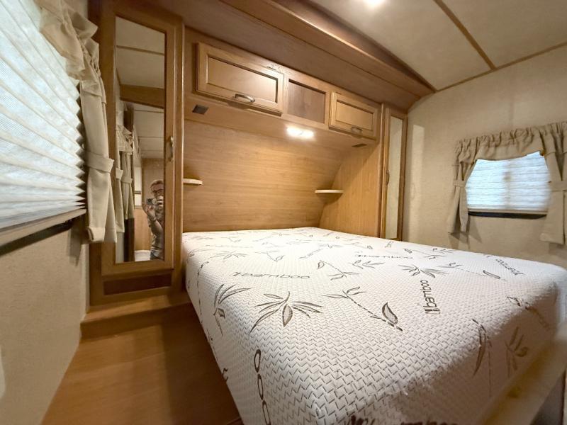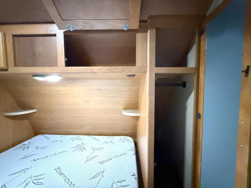As you enter the travel trailer, to the right is a front private bedroom featuring a queen bed with shirt closets on either side of the bed, and overhead storage as well.