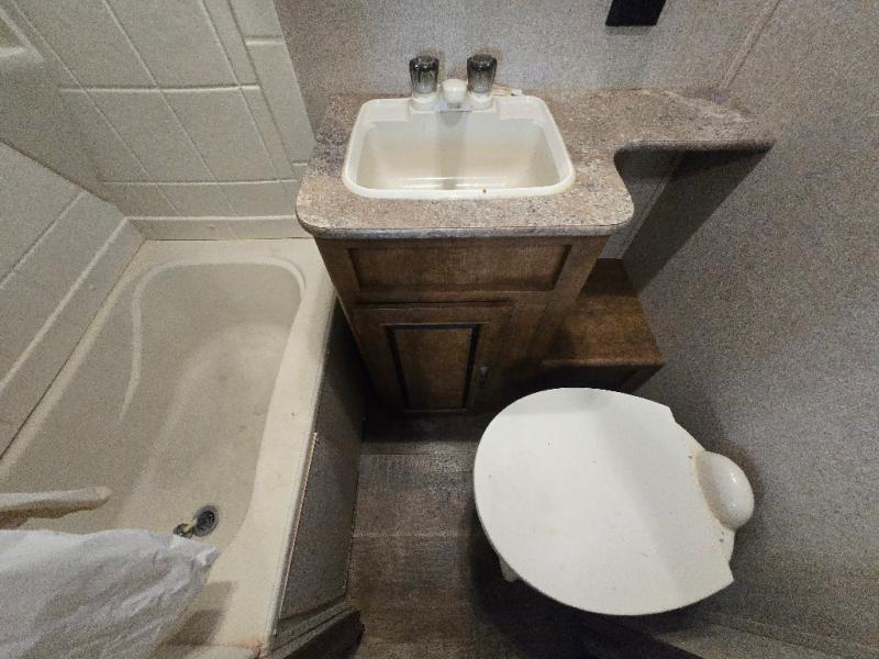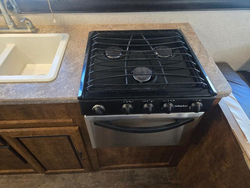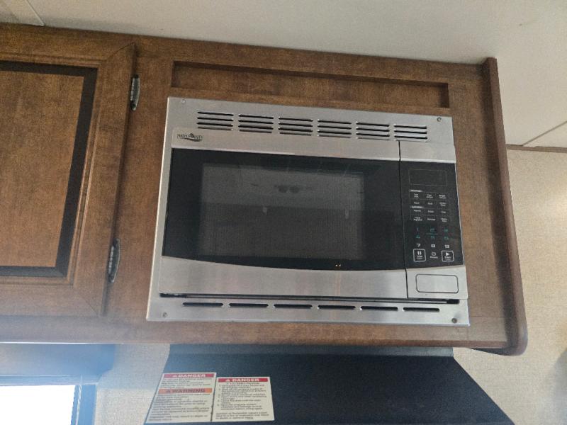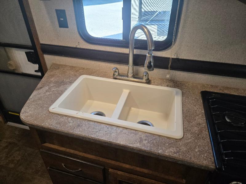 As you enter the travel trailer, to the left there is a double kitchen sink, range, microwave, and a booth dinette. On the opposite side of the travel trailer you will find a sofa with overhead cabinets, plus a refrigerator and pantry for your food storage needs.
