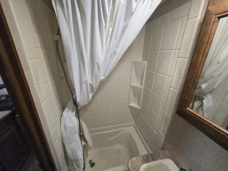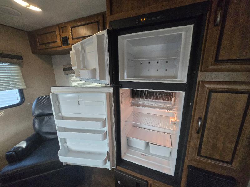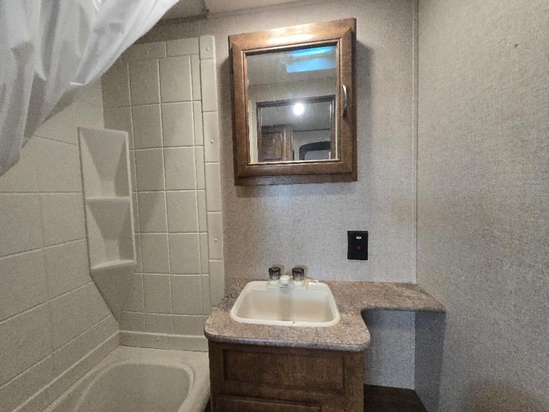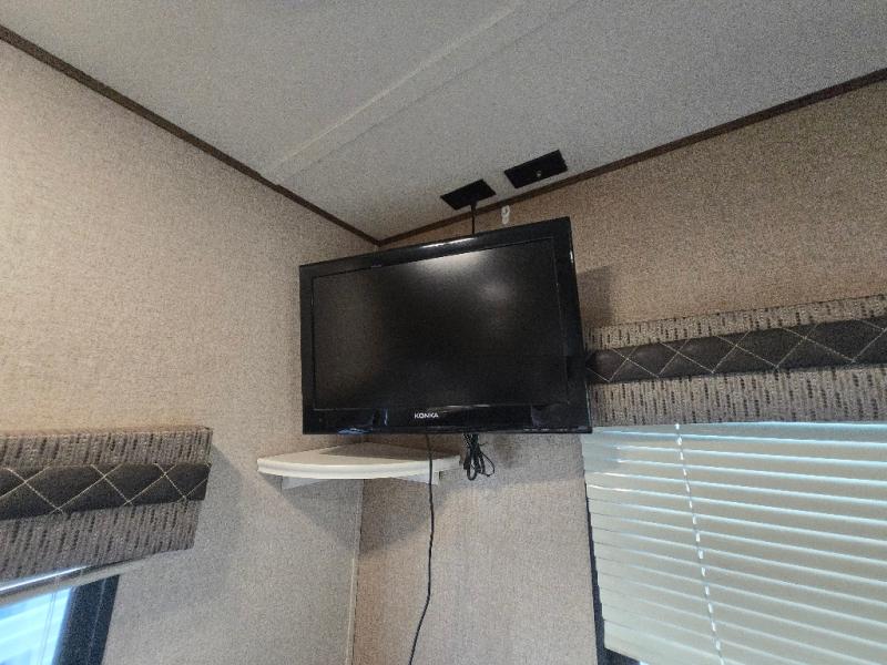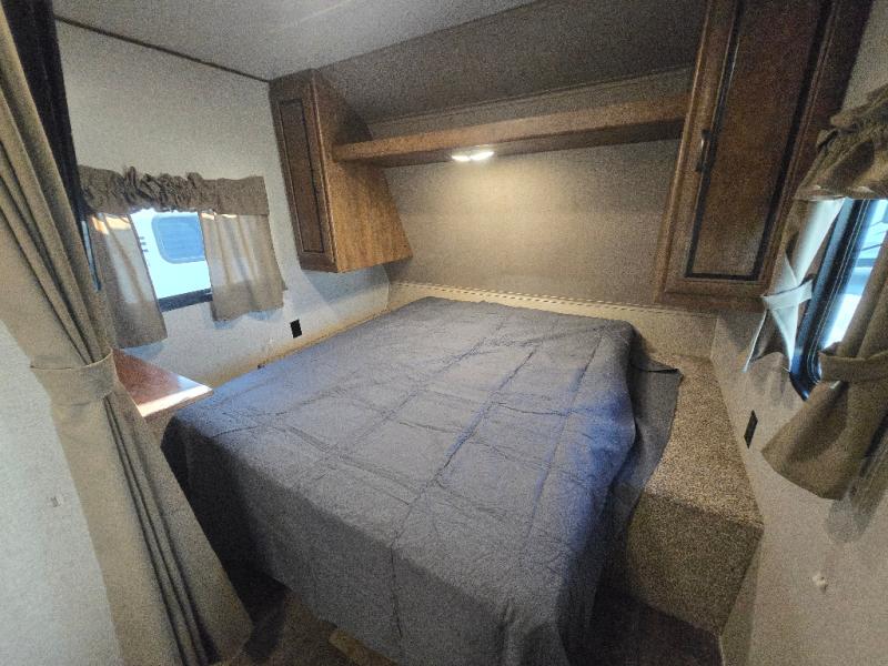 There is a privacy curtain dividing the main part of the travel trailer from the front bedroom. The bedroom offers a queen bed, and two shirt closets, as well as overhead storage which helps to keep your things organized, plus more!