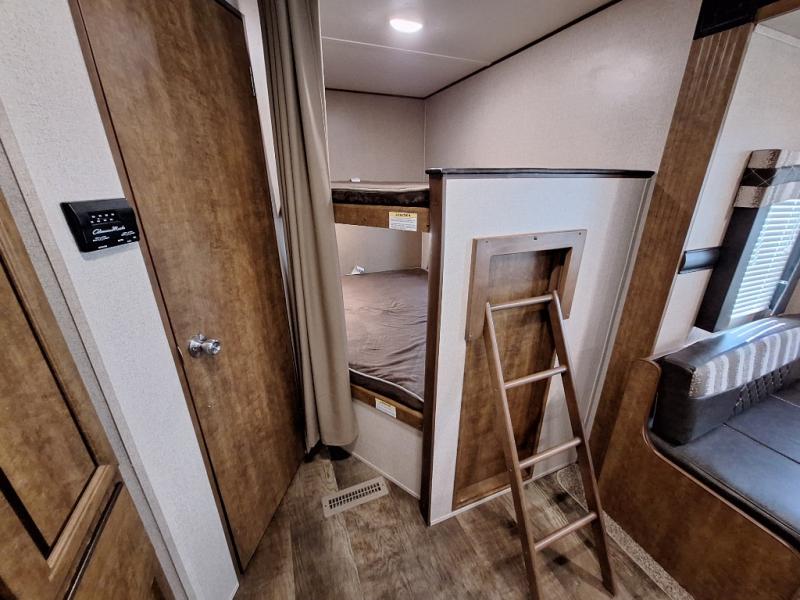 In the rear you will find the bathroom and set of bunks. The bathroom offers a 40" tub/shower, toilet, and corner sink with overhead medicine cabinet. The opposite rear corner features a set of double bed size bunk that provide more sleeping space for friends and family to come camping with you. There is also a ladder which allows easy access to the top bunk.
