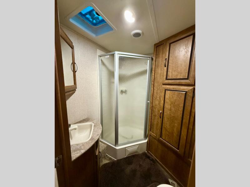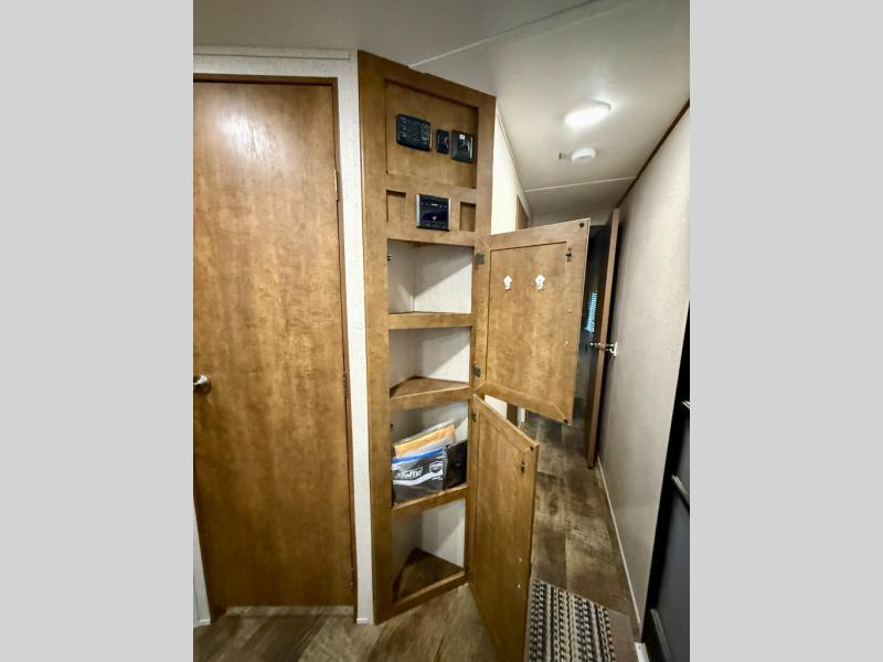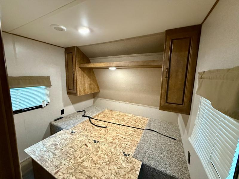 The front private bedroom features a comfortable queen size bed with dual shirt closets, overhead storage, and so much more!