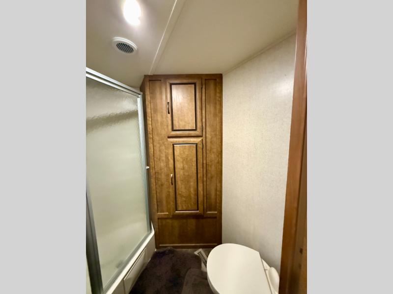 The bathroom features a 34" angled shower, a toilet, and a corner vanity with sink. There is also a linen cabinet that will hold all of your towels and toiletries.