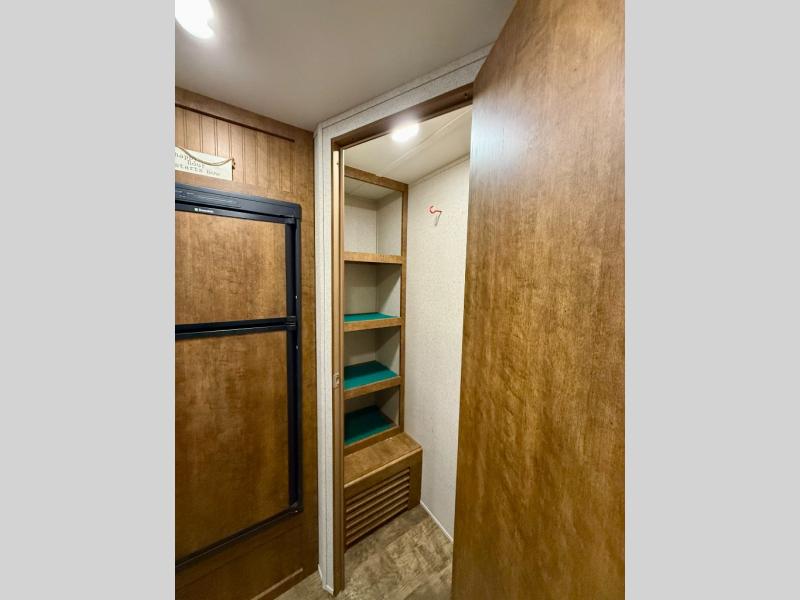 Inside the living space you will find a kitchen featuring a refrigerator, a three burner range, and double kitchen sink. There is also plenty of overhead storage space as well. There is even a walk-in pantry for all of your dry and canned food items to be stored.
