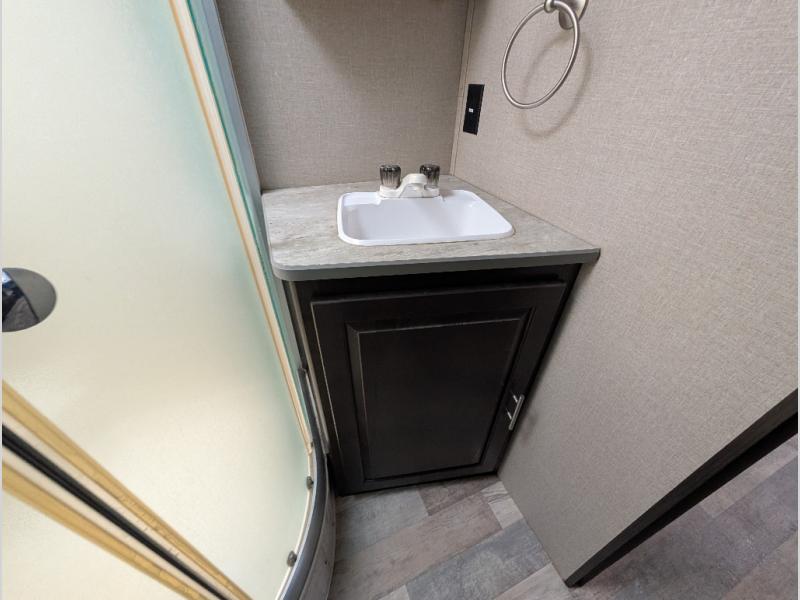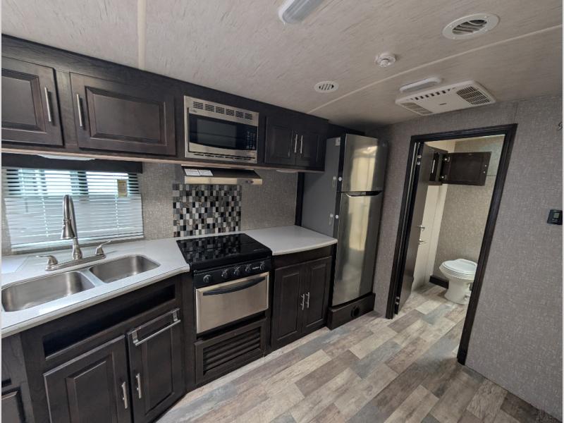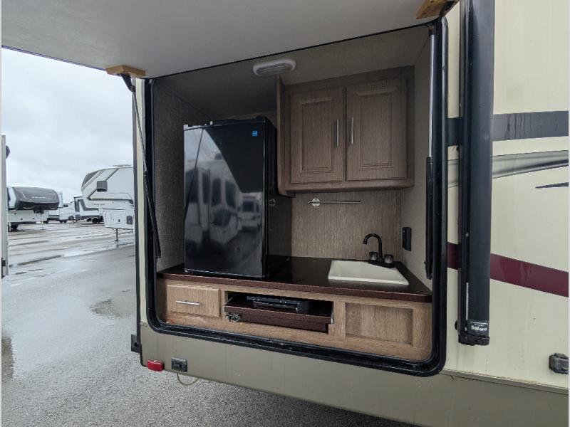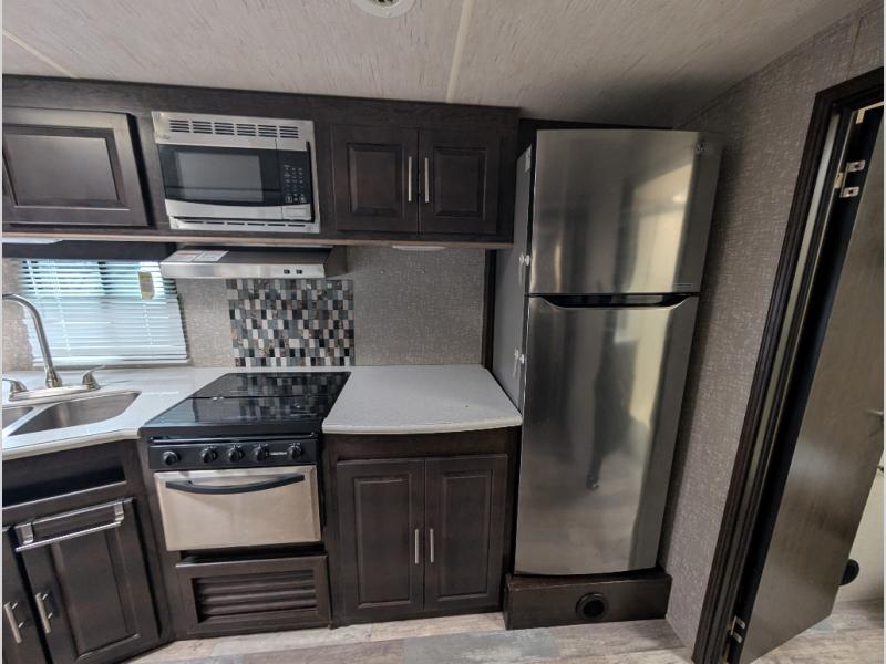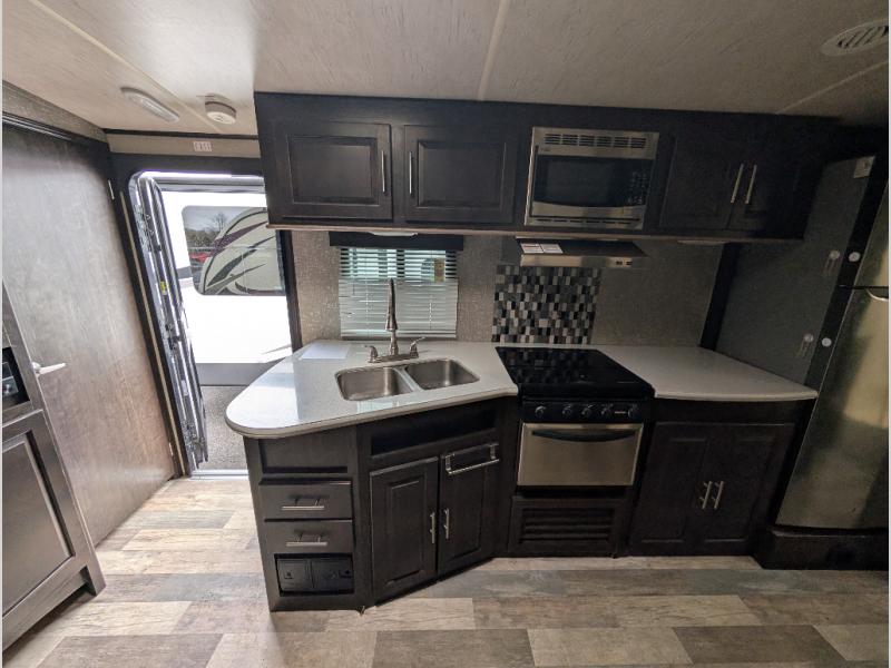 Before you enter F-265RBSS take a look at the outside kitchen near the rear of the trailer. There is a pull-out two burner cooktop, refrigerator, single sink, and counter space for the cook in the family.