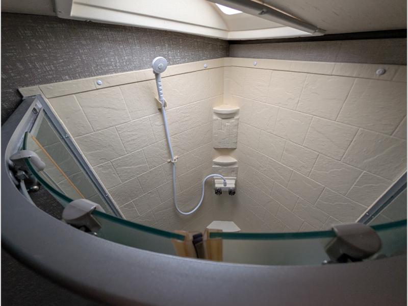 The rear bath includes a radius shower, toilet, sink, and linen storage.