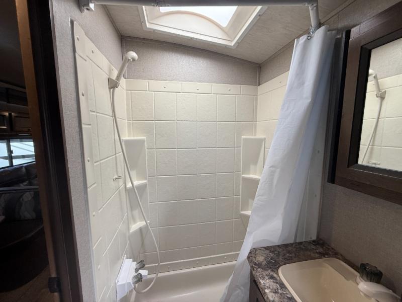 Head toward the rear of the trailer, and the curb side bathroom is on your left. Inside the bathroom you will find a shower, sink, and toilet. The second entry door into the trailer provides easy access to the bathroom when playing outside.
