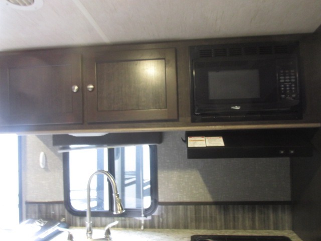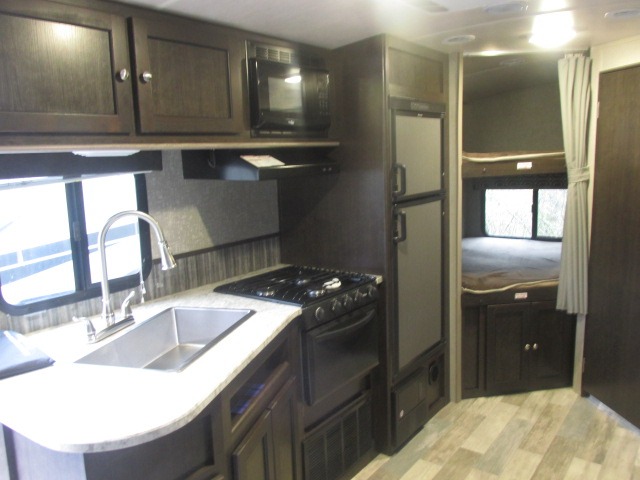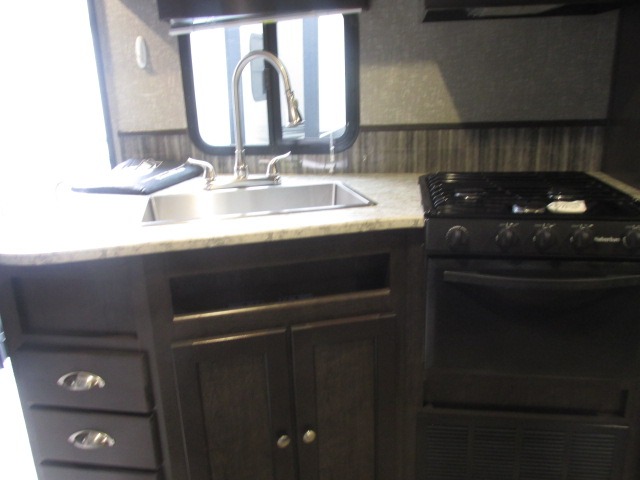 To the left of the entry door find a double sink, a three burner range, and refrigerator. There is a storage pantry just off the dinette slide for dry and canned goods too.