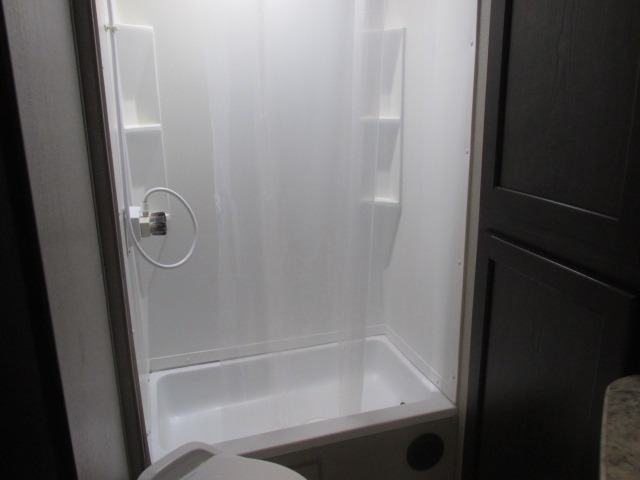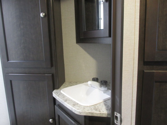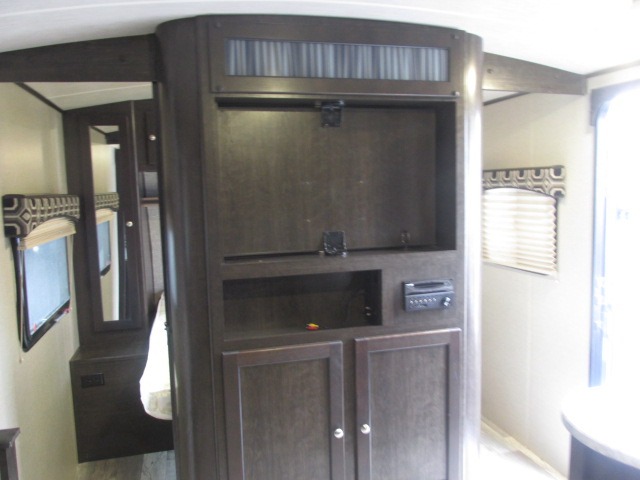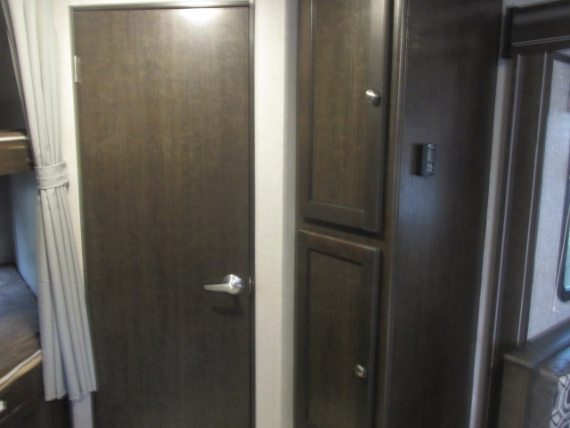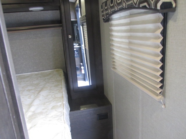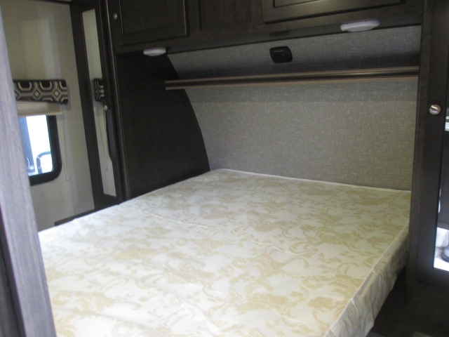 Step in and notice the entertainment center straight in the door just off the foot of the queen bed in the front master bedroom. You can easily access either side of the bed, and there are shirt closets, nightstands, and overhead cabinets for clothing and additional storage needs.