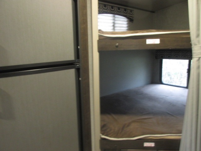 The rear of this travel trailer model 240BHS offers a set of double bed bunks with the inside corner angled to provide more room between the beds and the rear complete bathroom right next door.