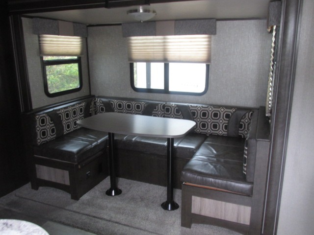 A large u-shaped dinette slide provides a grander walk space from front to back when it is extended. It features ample seating for the whole gang to enjoy meals together, or a board game, plus just hanging out.