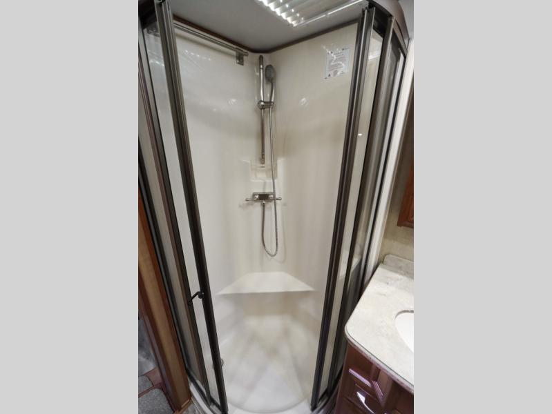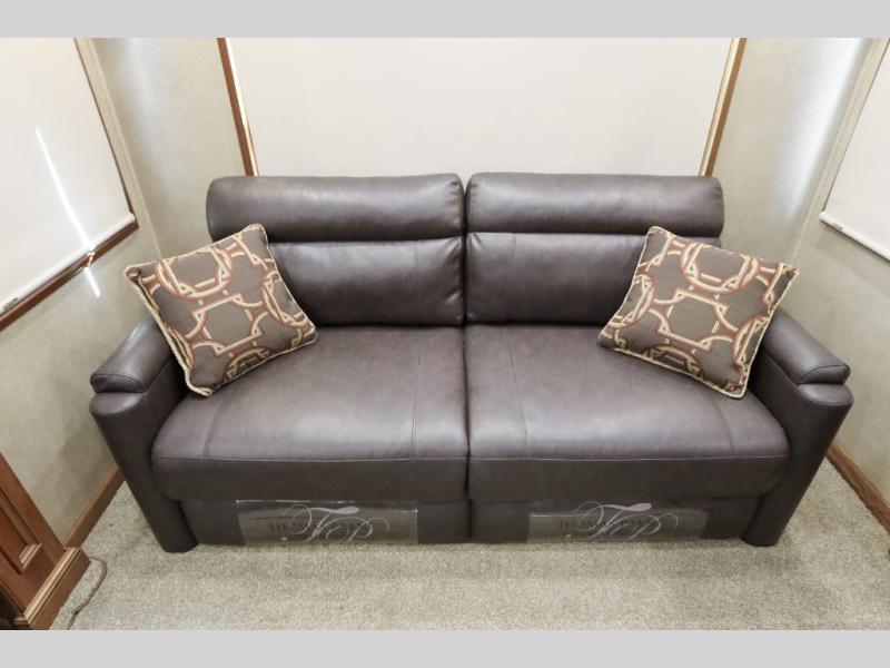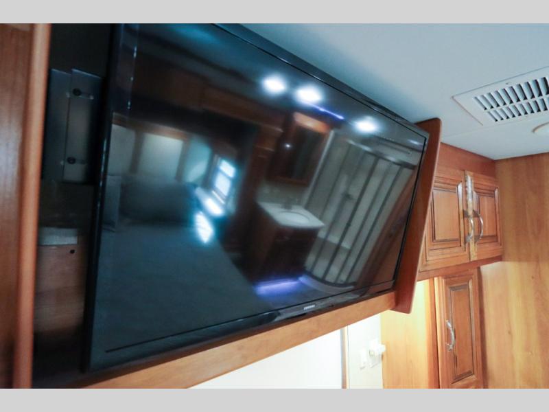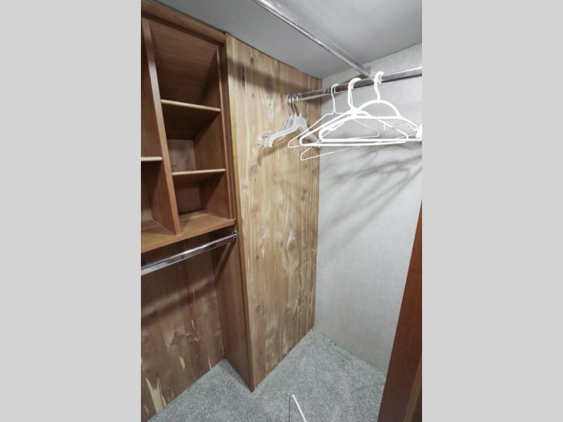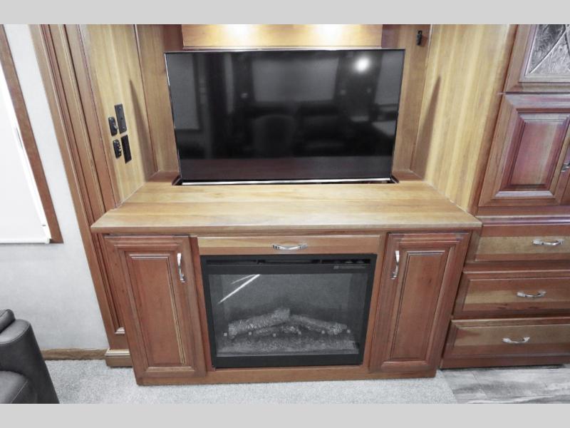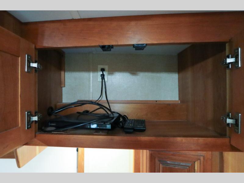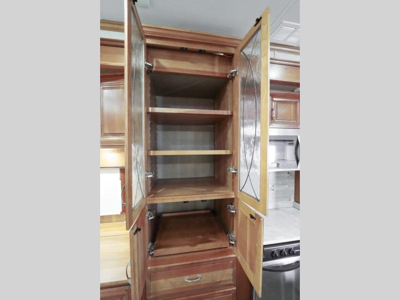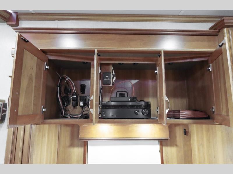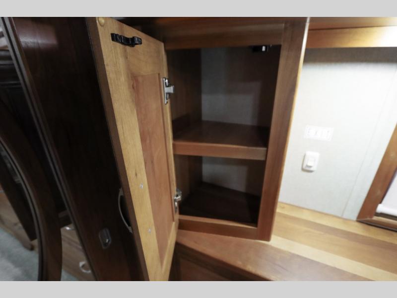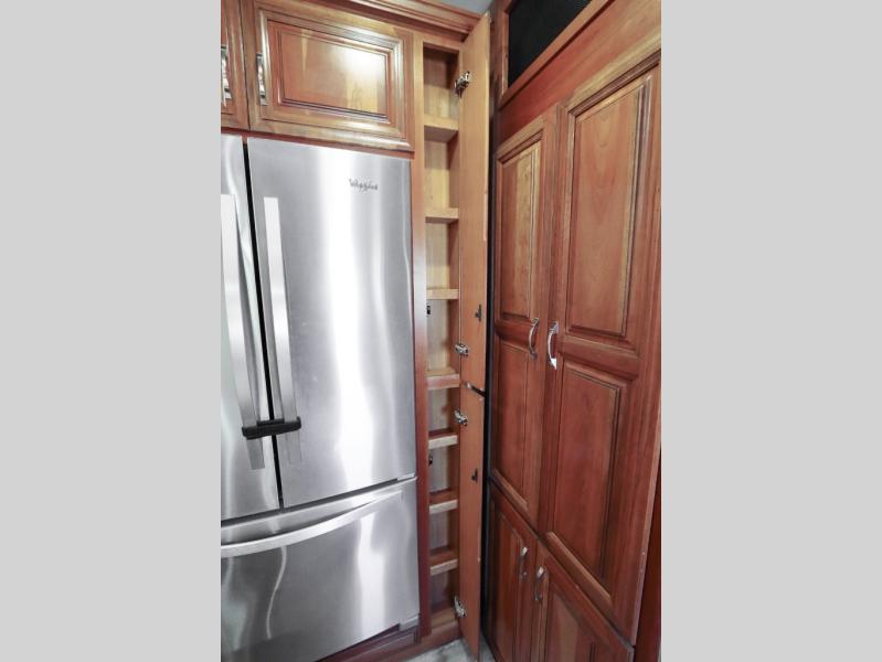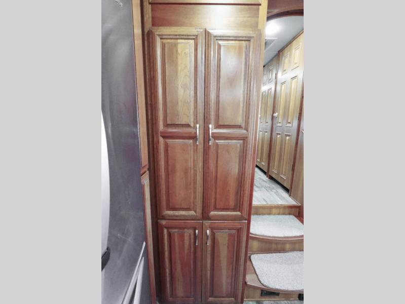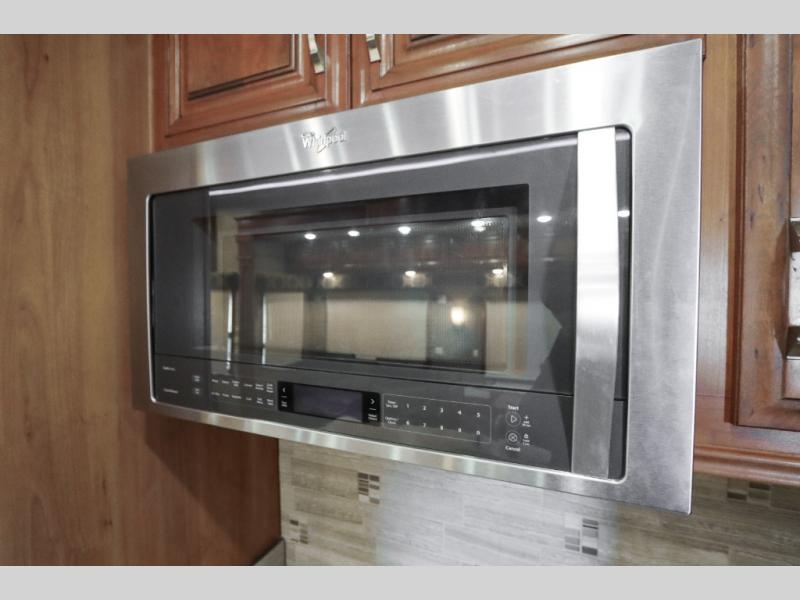 Along the rear wall find a sofa and an overhead cabinet. The sofa provides ample seating and perfect viewing of the power lift TV in the slide out opposite the door side. Within that same slide out find a storage cabinet for your things, plus a range with convection oven, counter space, and a refrigerator. More storage is located just inside the main entry door where you will find a coat closet and pantry.