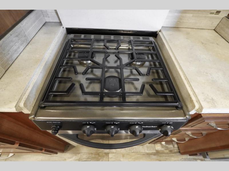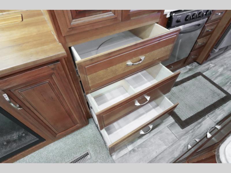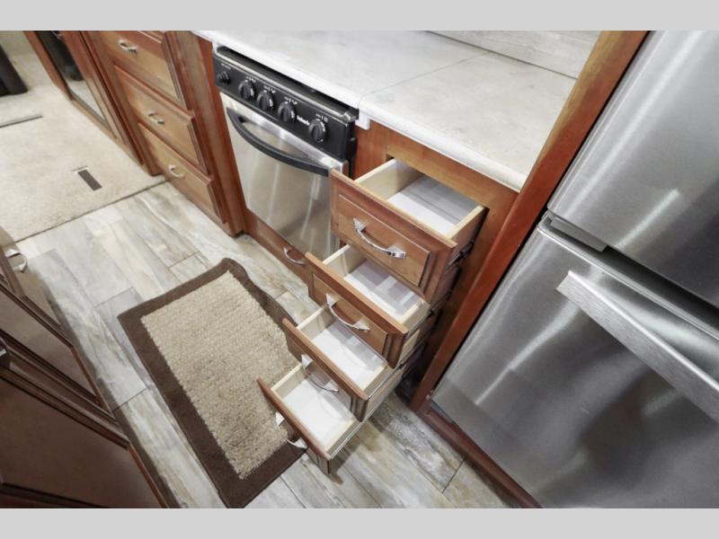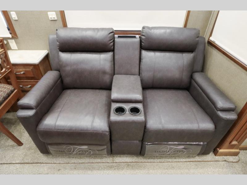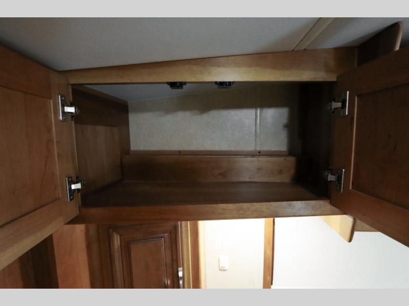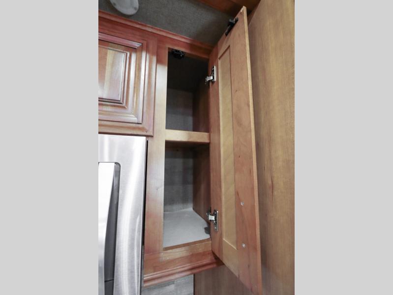 The kitchen and living area feature dual opposing slide outs with a dinette slide to the left of the entry door where you will also find two theatre seats as well. There is also plenty of overhead storage throughout.