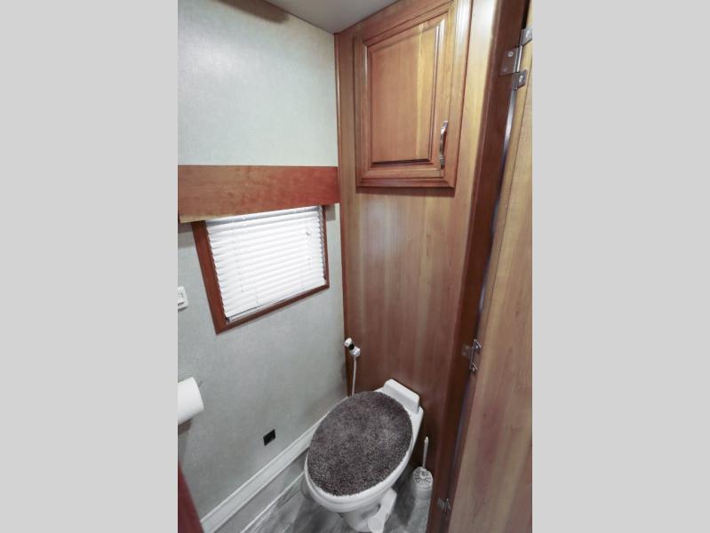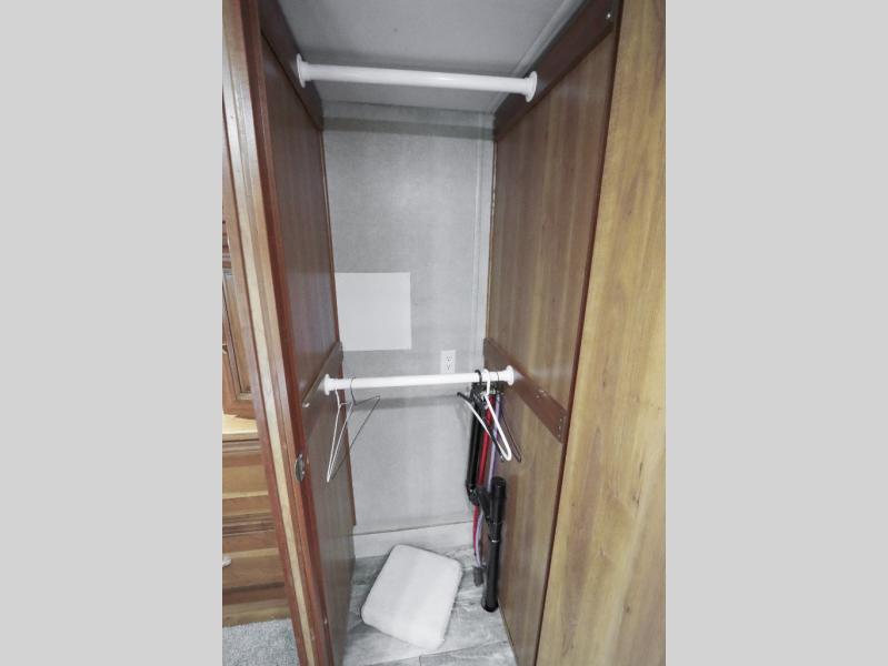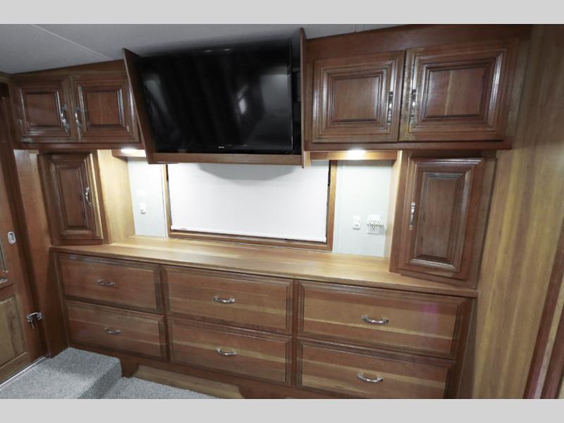 Head up the steps to a side aisle bath featuring a corner tub/shower, linen cabinet, sink with medicine cabinet overhead, and toilet. Out in the hall across from the bedroom find a slide out wardrobe prepped for a washer dryer that also includes a front king bed and nightstand. The wall opposite the bed is where you will find a vanity with drawers including overhead cabinets and a space for a TV overhead in the center. The front wall features a walk-in closet with dresser, and shelves, plus so much more!