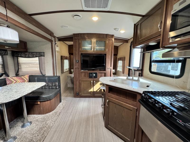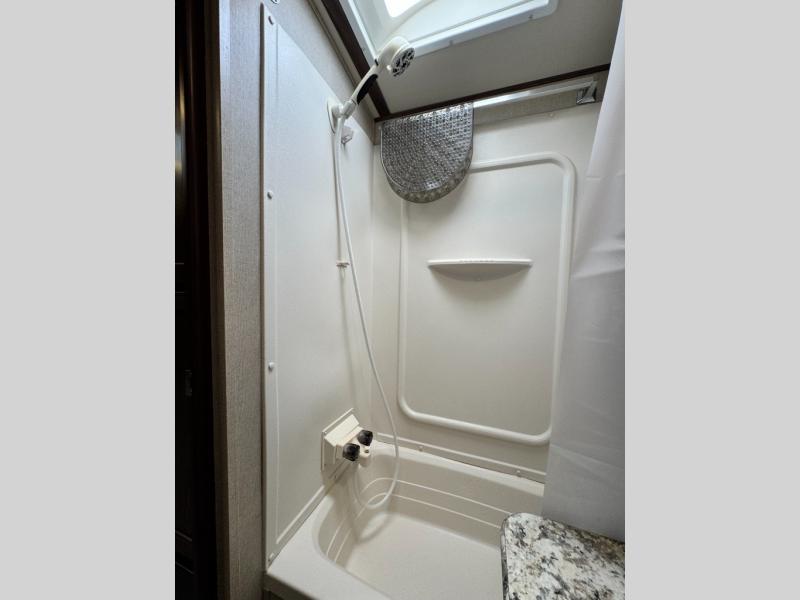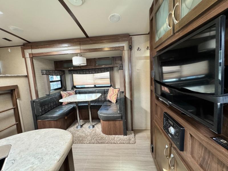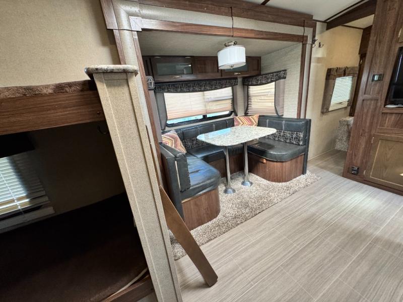 Straight in from the same side entry door find a u-shaped dinette slide out. This is perfect for mealtime, and can also become added sleeping space when needed at night.
