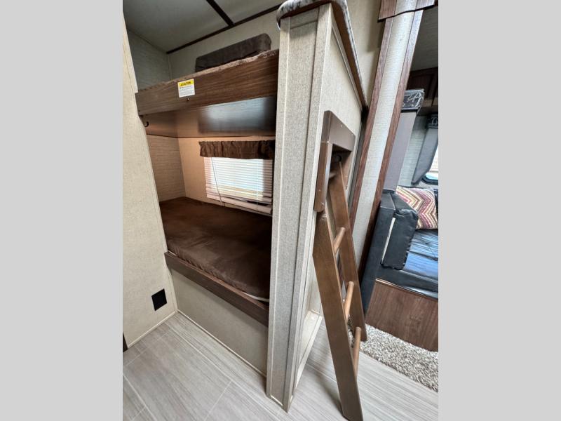 This Dutchmen Aerolite travel trailer 221BHSL is perfect for a family traveling with kids or extra guests. The bunks in the rear corner, and u-shaped dinette provide extra sleeping space for at least 4 people. There is also a single slide for added foot traffic space inside, and a king size bed!