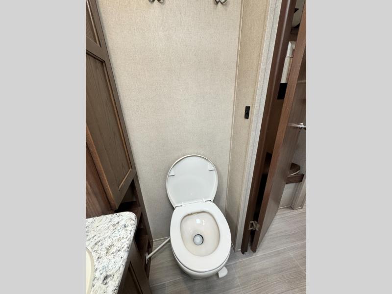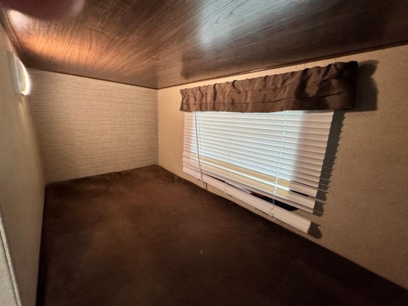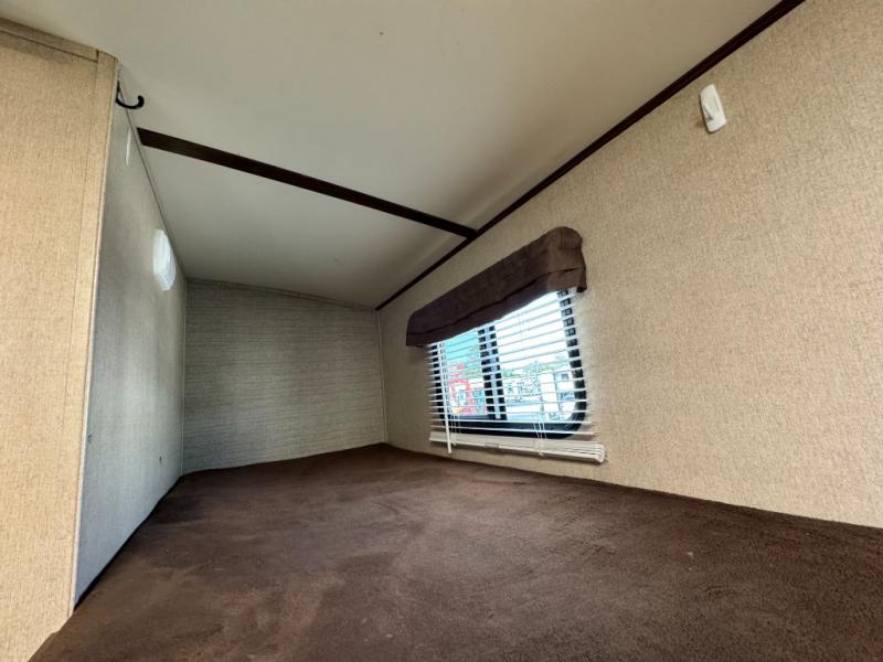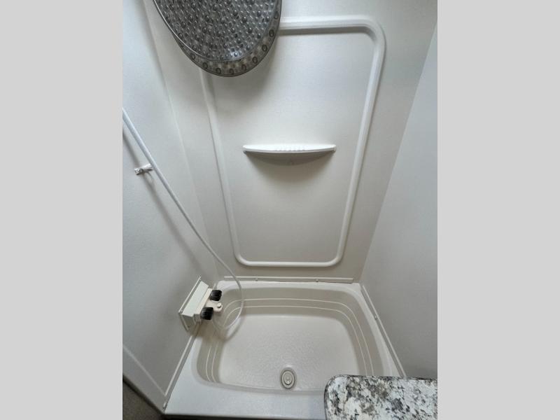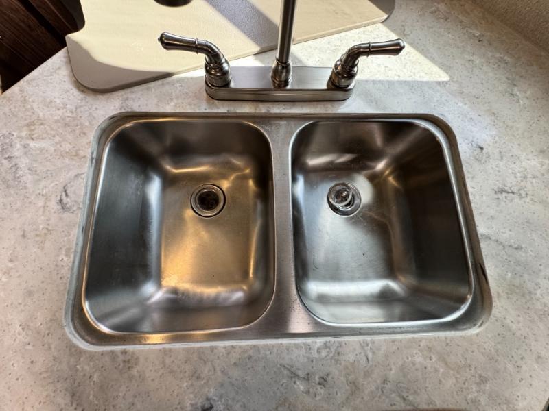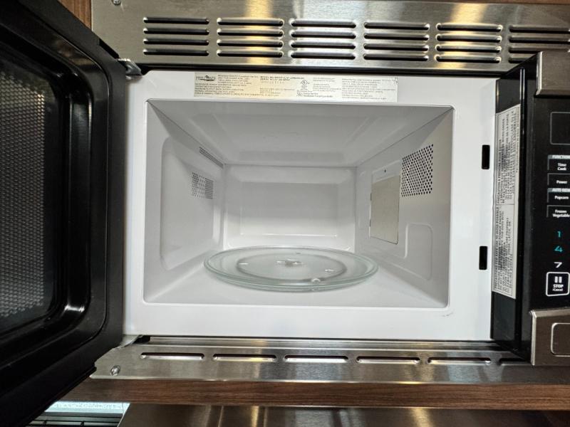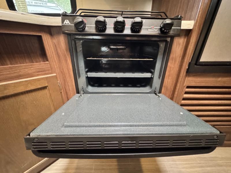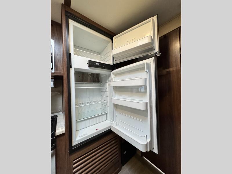 The kitchen in this Aerolite will easily allow you to prepare and cook food for your family with a three burner range including an overhead microwave, a double sink on an angled countertop, a pantry, and a refrigerator for your perishables.