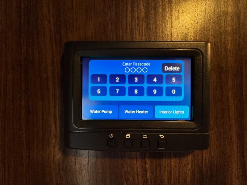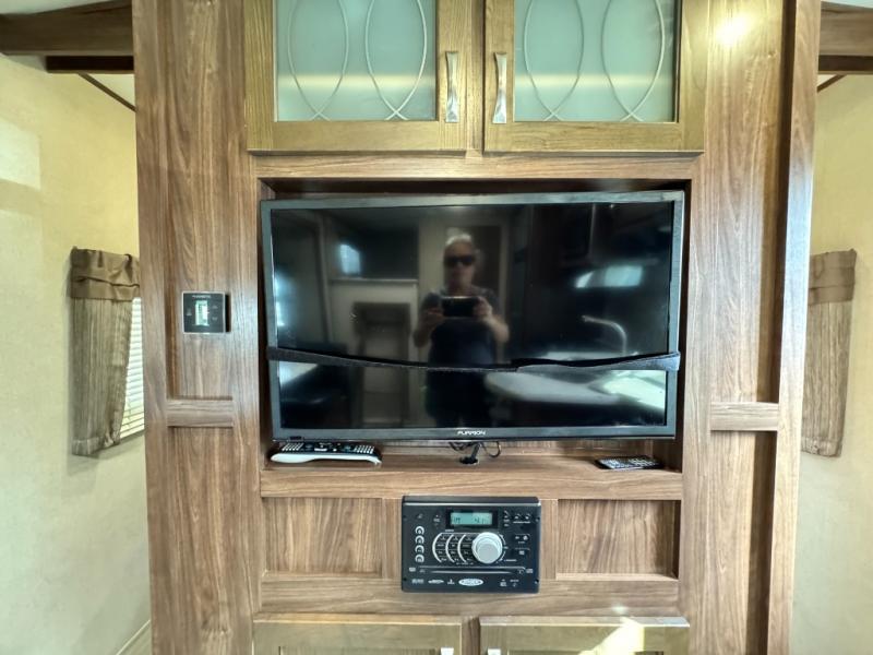 As you enter you will find an entertainment center straight ahead. There are sliding doors on either side of it that lead you into the front master bedroom which includes dual wardrobes, a king size bed, and overhead storage for your things.