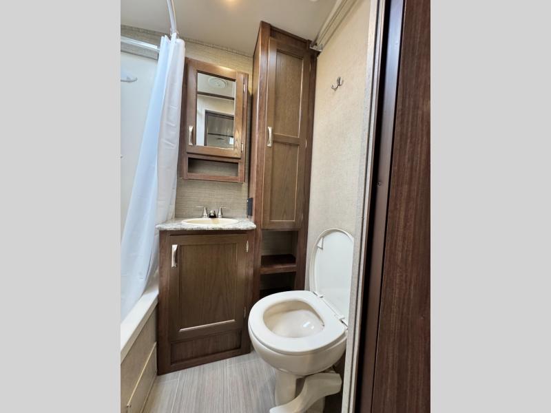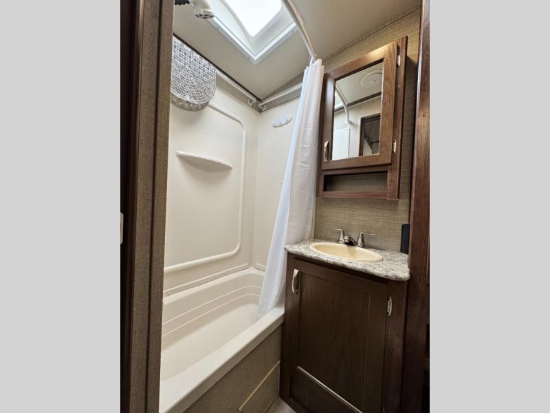 A rear corner bath features a convenient tub, a toilet, and a vanity with sink. The bunk beds are next to the bath and include a ladder for easy access.