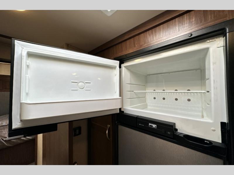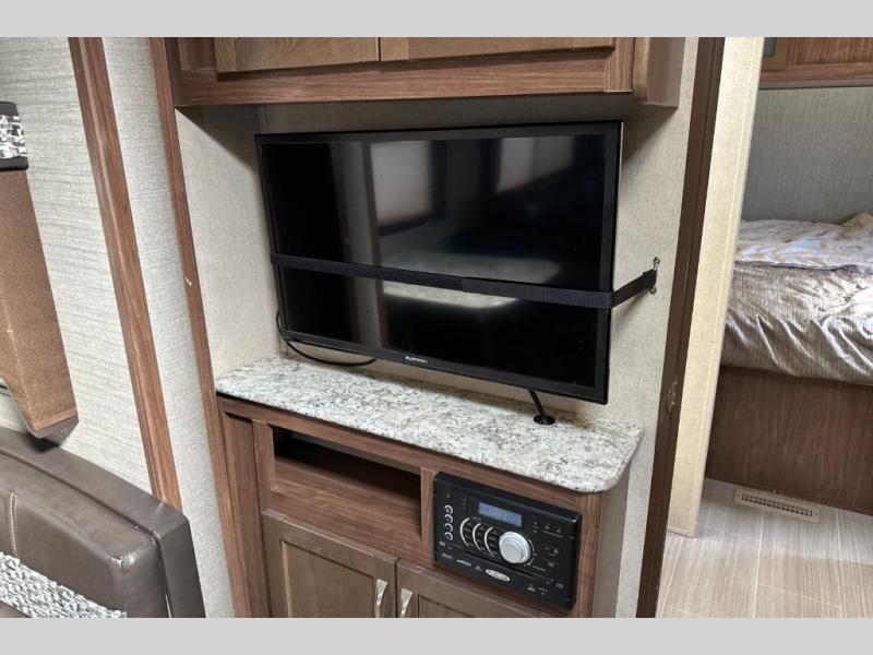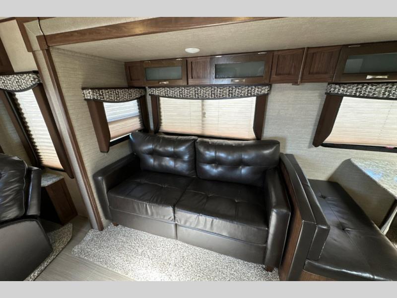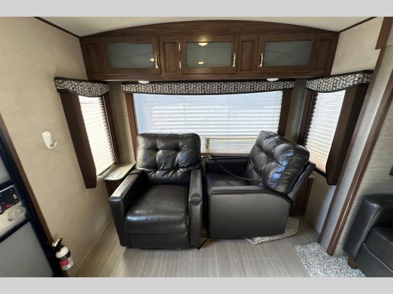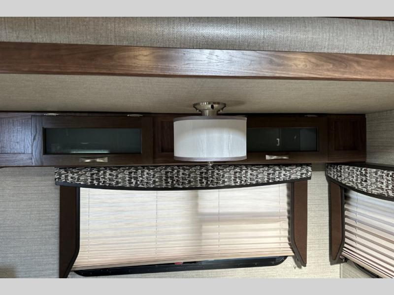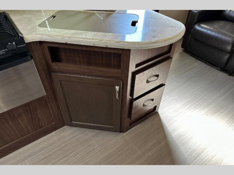 Stepping inside through the door furthest to the back of the unit you will find along the rear wall two lounge chairs for seating, plus an adjacent slide along the road side with more seating thanks to a sofa and 40" x 74" booth dinette. There are overhead cabinets along the rear and entire slide for all of your things to be neatly tucked away. A nearby entertainment center can easily be viewed from any seating in the room.