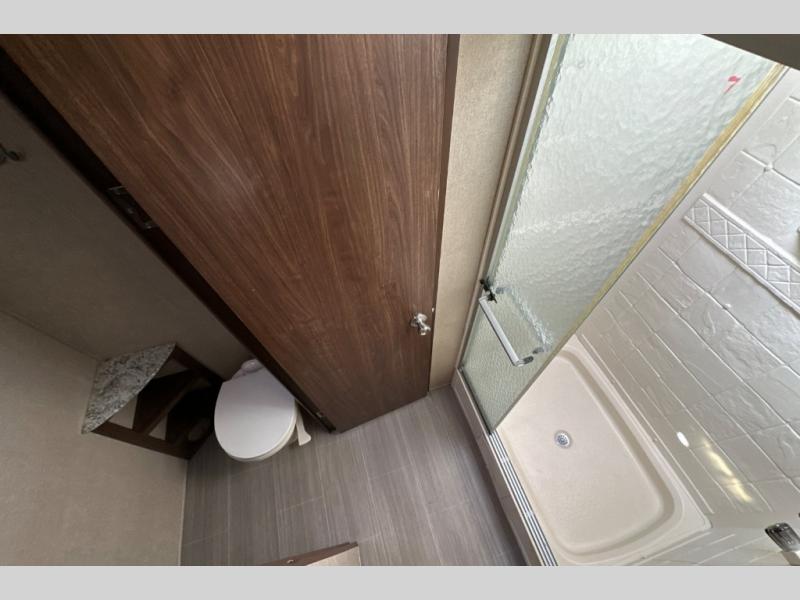 Beyond the kitchen area there is a split bath with shower on the left and a private toilet area including a vanity with sink and storage on the right.
