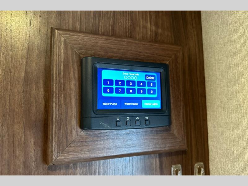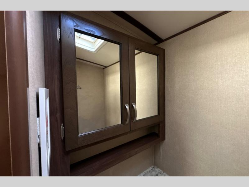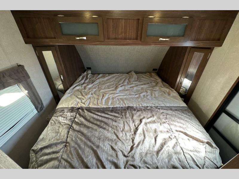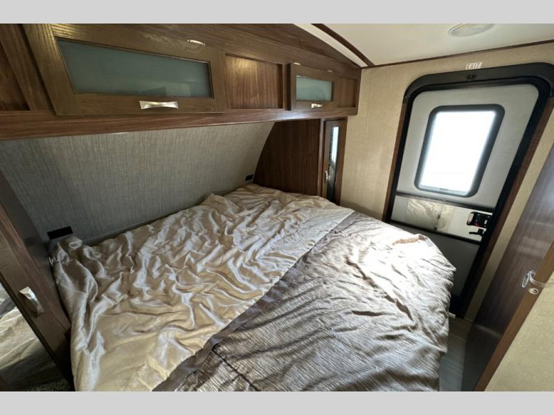 A sliding door leads into the front master bedroom, or you can use the exterior side entry as well. Inside find a king size bed, dual wardrobes, and an overhead cabinet.