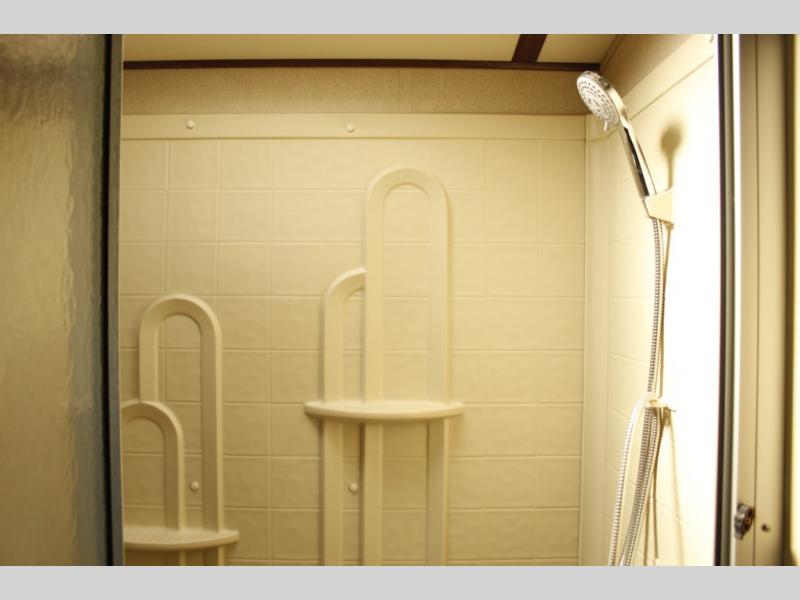 A rear bathroom highlights a large 27" x 54" shower, a corner toilet, a vanity sink with medicine cabinet above, and an overhead linen storage.