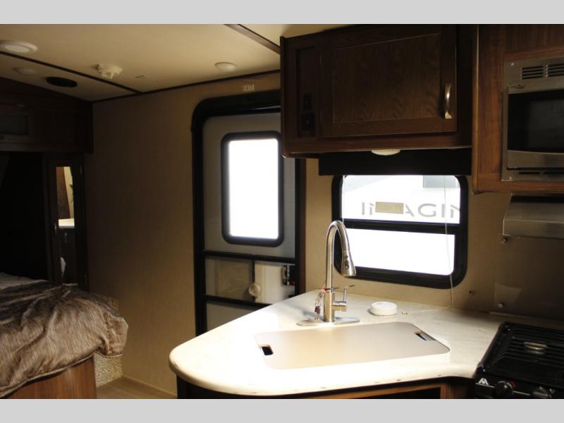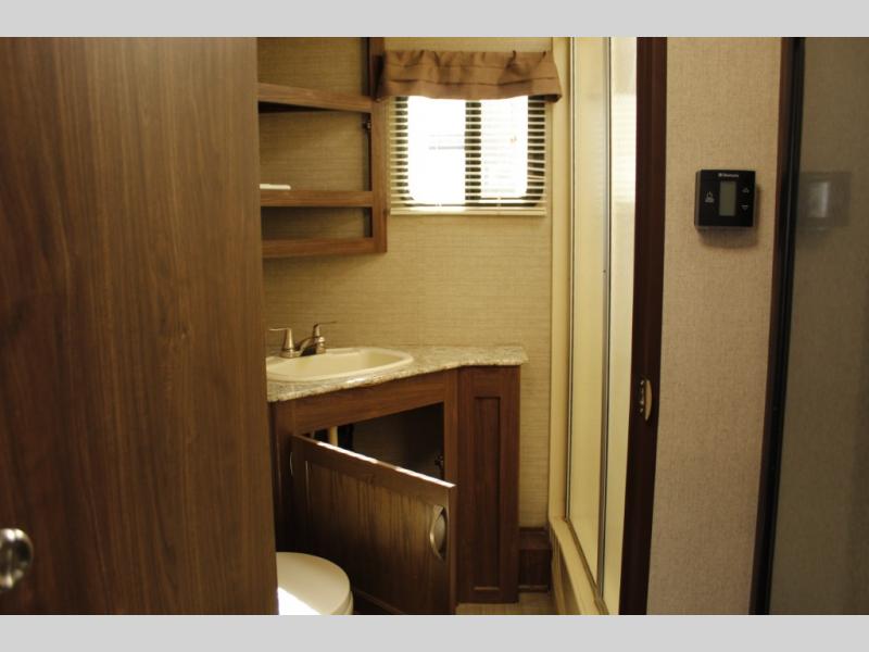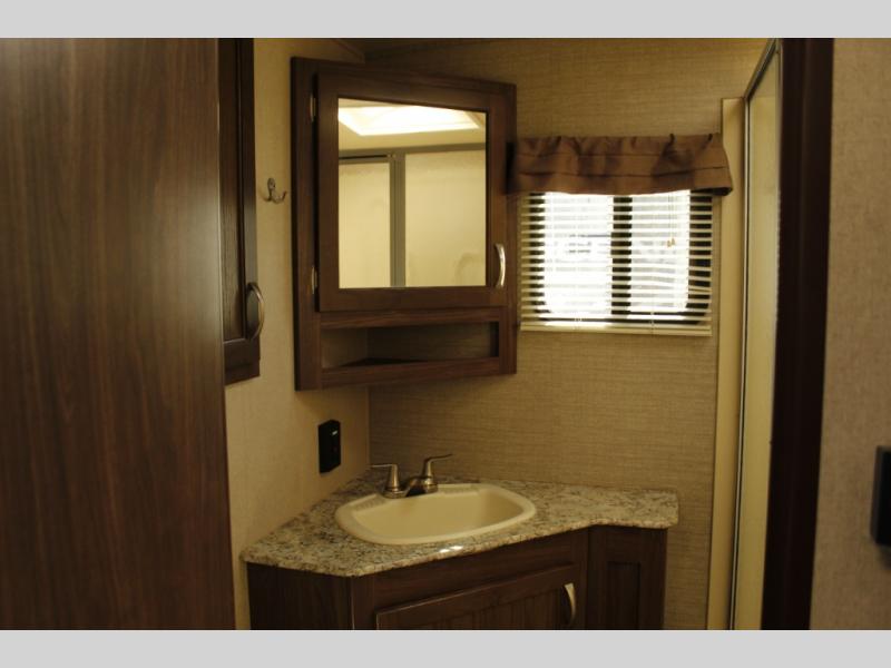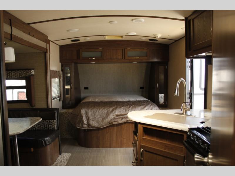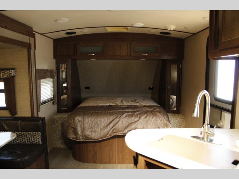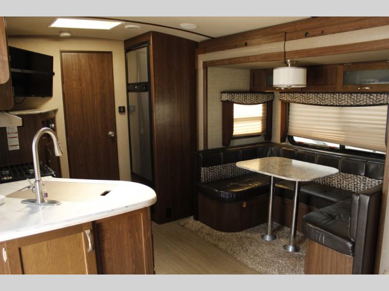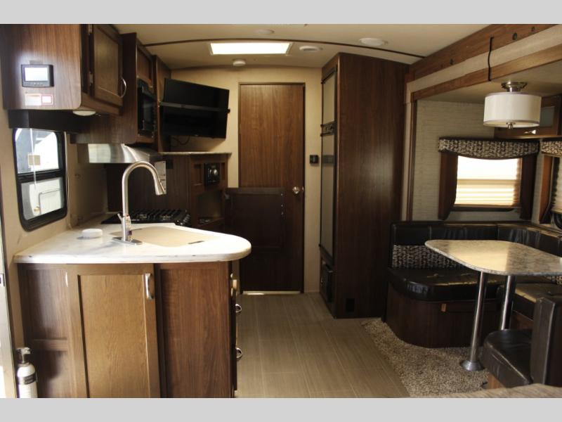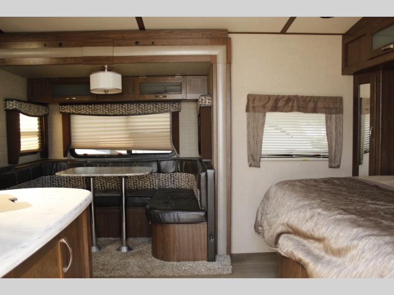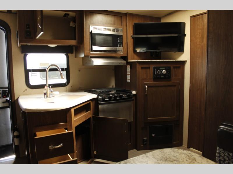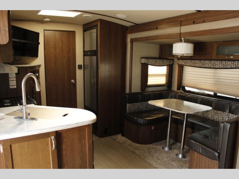 The 44" x 74" u-shaped dinette with overhead storage is in the trailer's slide out with a large refrigerator beside it. On the opposite wall, you will find the kitchen area that features an angled double sink, a three burner range with overhead microwave and cabinets. A corner pantry area with a TV mount above allows plenty of space for dry goods and inside time with the optional TV.