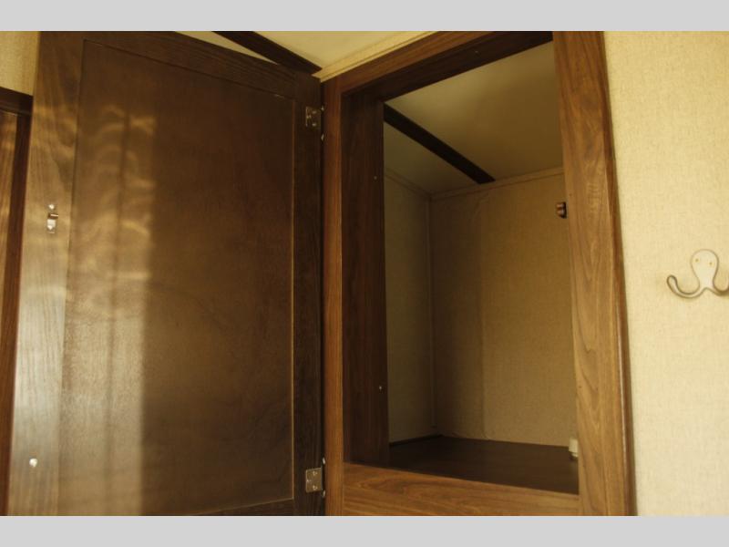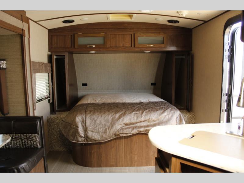 As you step inside to your right there is a front king size bed that features a wardrobe and nightstand on both sides as well as overhead cabinets for extra storage.
