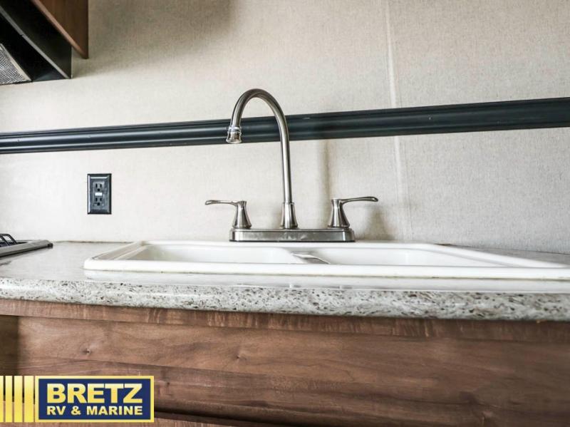 As you enter near the rear of the travel trailer, there is closet storage to your left and the bath entrance is straight ahead. As you continue around, the road side wall has the kitchen amenities. It provides a refrigerator, three burner range with microwave above, a double kitchen sink and overhead cabinets.