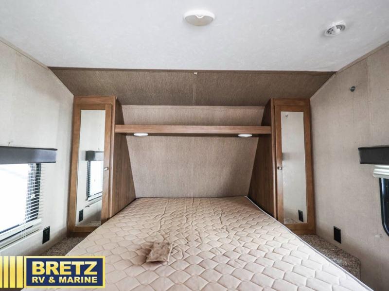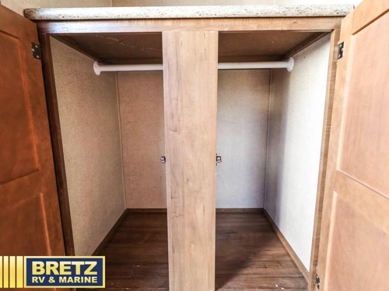 The front of the travel trailer has a walk-around queen size bed, a shirt closet on each side, overhead cabinets, and pass through storage.