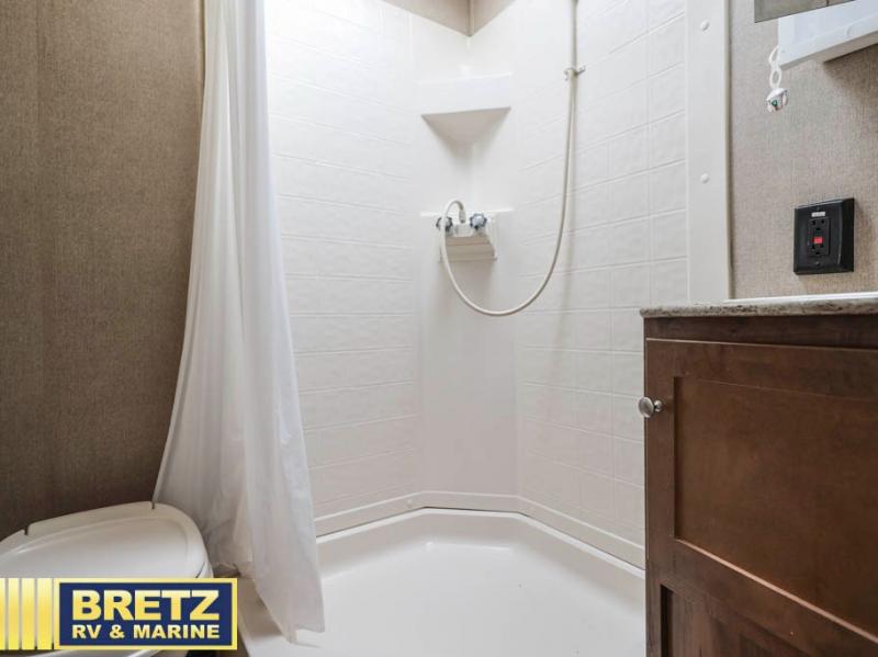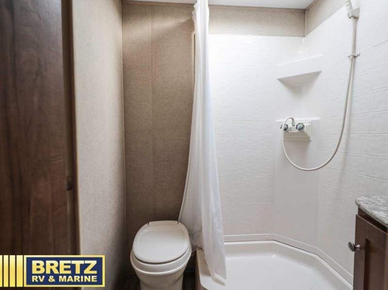 This Dutchmen RV Aspen Trail 1900RB travel trailer offers a rear corner full bathroom. It includes an angled shower with skylight, a corner vanity with sink and a toilet.