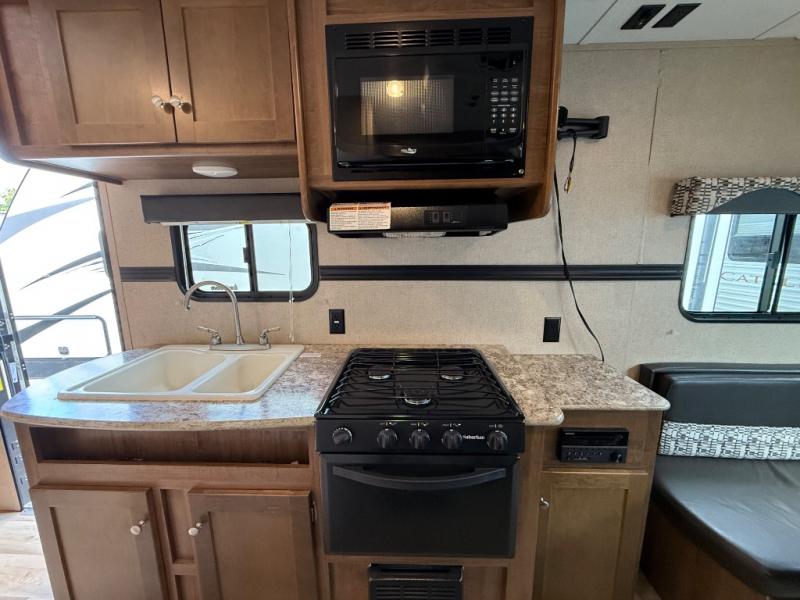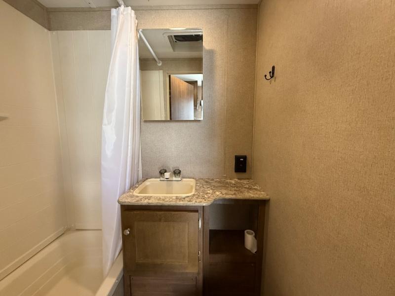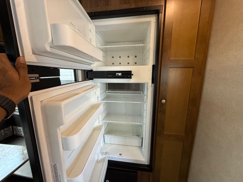 Next to the bathroom you will find a pantry and refrigerator, and on the opposite side of the trailer there is a three burner range, microwave, double kitchen sink, and overhead cabinets.