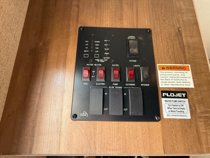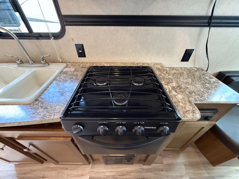 Located in the rear there is a u-dinette with a shelf on one side and overhead cabinets. At night the dinette converts into a bed for additional sleeping space. Next to the three burner range you will find an entertainment center, and more!