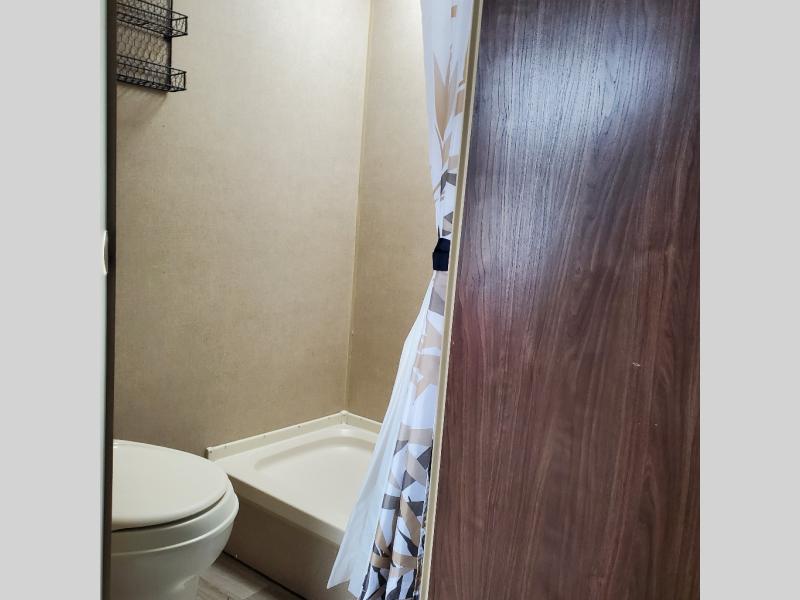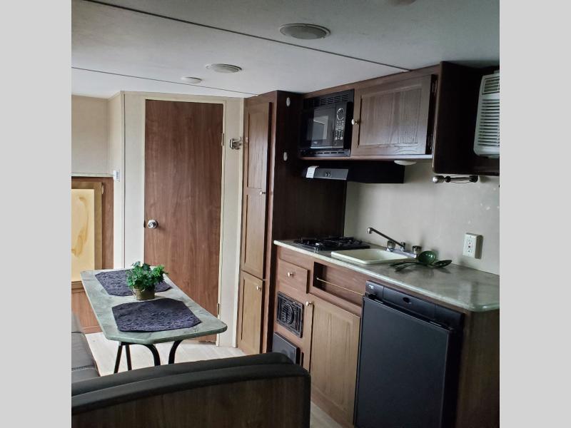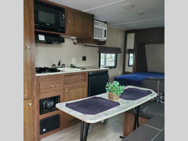 There is a dinette/gaucho with overhead cabinets across from the kitchen area. You can dine, play games, or even sleep in this space. In the kitchen you will find a pantry for dry goods, a two burner cook-top, single sink, microwave oven, and more overhead cabinets plus lower storage too.