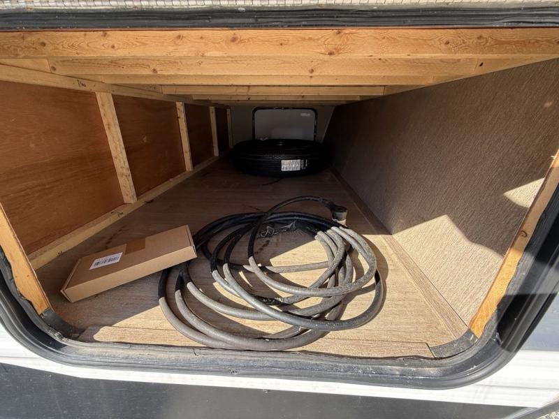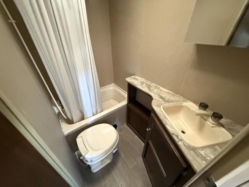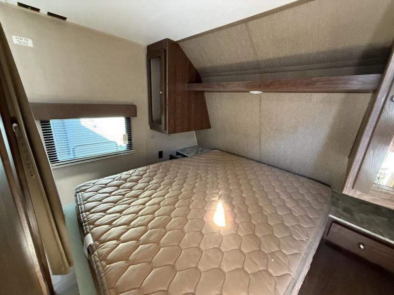 As you enter to your right there is a front bedroom with a queen bed, a shirt closet and nightstand on each side including an overhead shelf between, plus curtains for privacy.