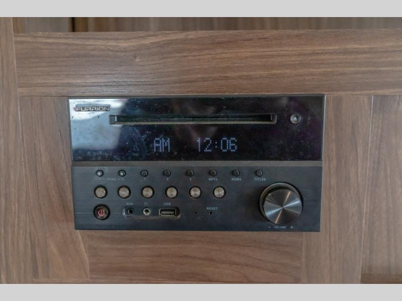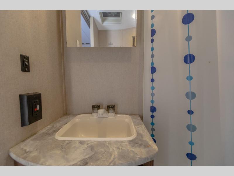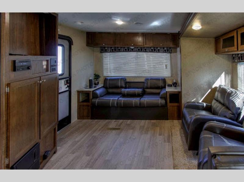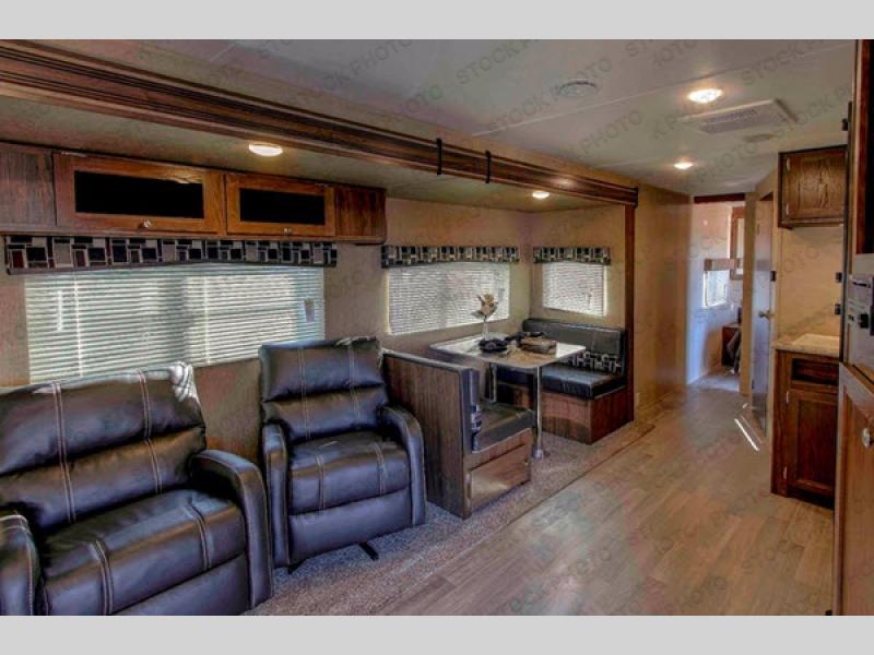 As you enter the main door to your left you will see a sofa with two end tables and overhead cabinets along the rear wall. Straight ahead, a single slide out provides two chairs and a booth dinette. This allows for more walking around floor space plus plenty of seating for your guests.
